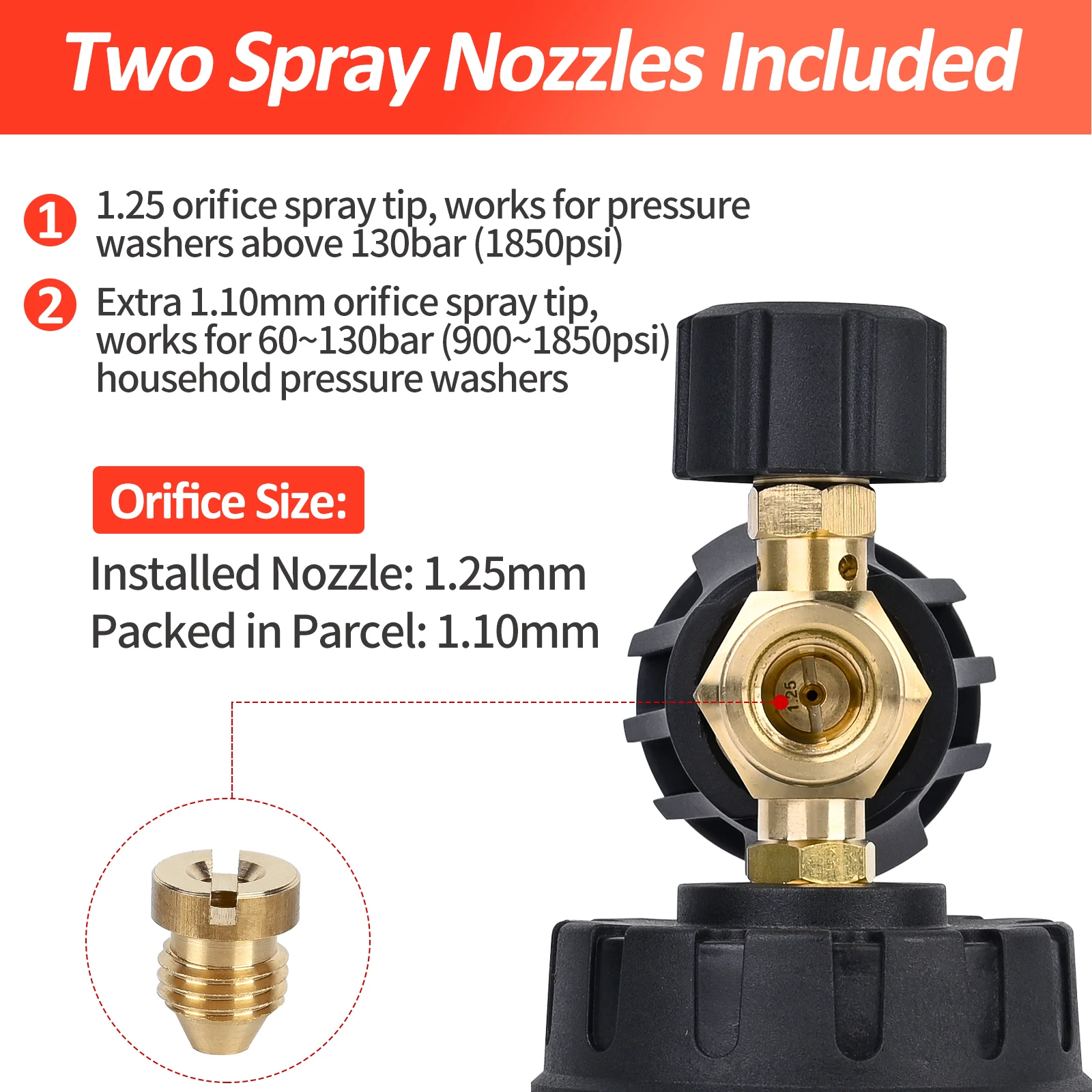 - Five color-coded nozzles (0°, 15°, 25°, 40°, soap spray) allow quick adjustments for different cleaning needs, supported by a black mounting bracket for easy nozzle change.
