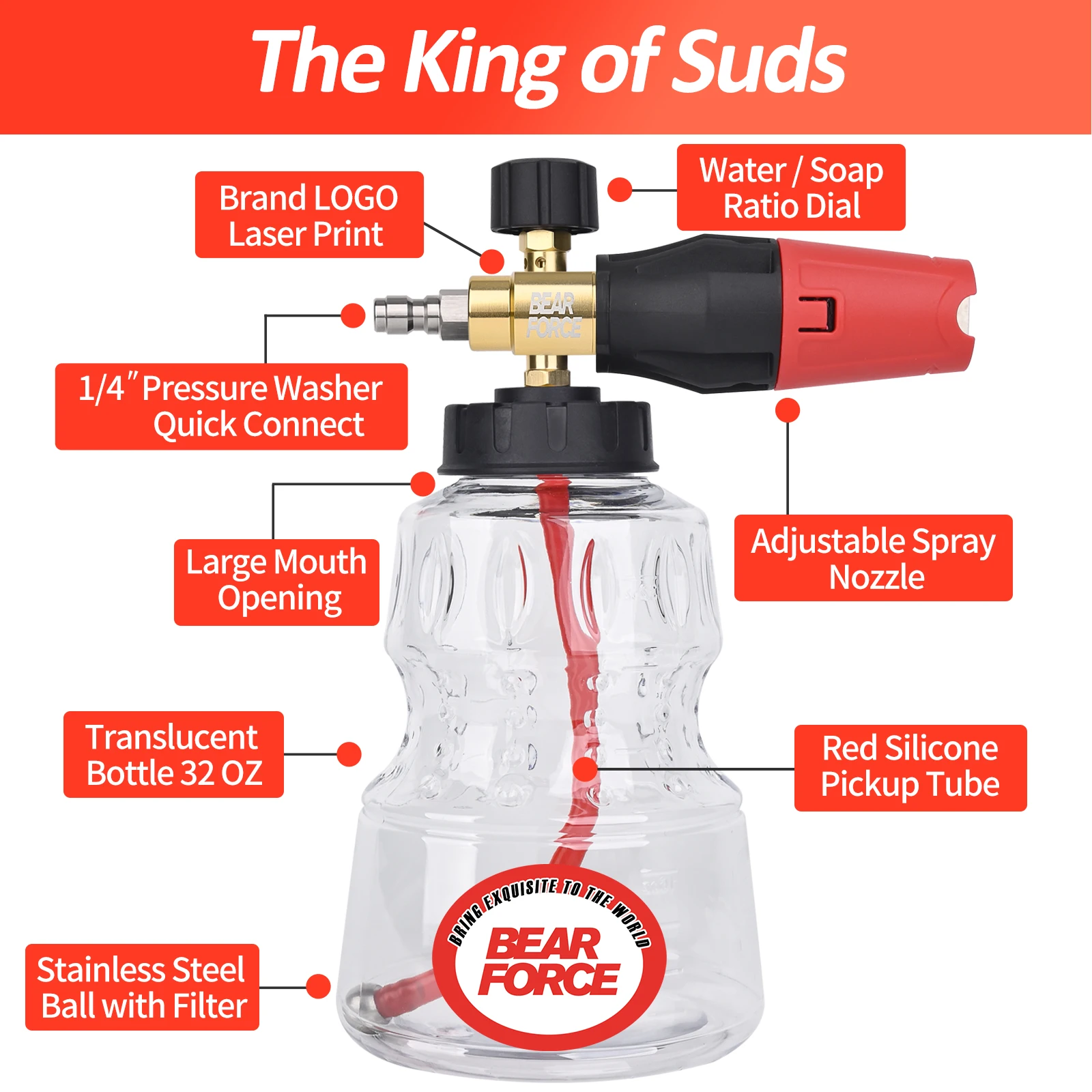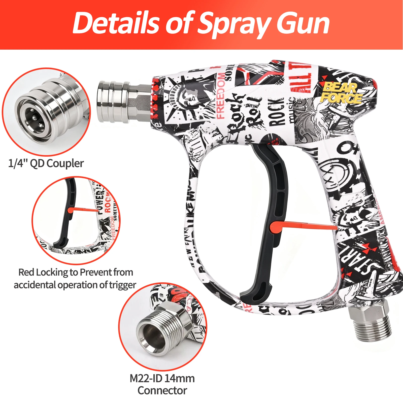Experience powerful cleaning with this trendy BEAR FORCE pressure washer set, combining durability and visual appeal. Its compact design features a vibrant black, white, and red exterior with North American-inspired graphics. The textured, impact-resistant housing offers a strong grip and longevity, while the transparent container allows easy soap or foam filling. Brass and copper accents enhance its rugged look, making it as appealing as effective. With a maximum pressure of 3000 PSI (210 Bar), this set handles extensive cleaning tasks efficiently—whether washing cars, cleaning patios, or windows. The kit’s thoughtfully designed components ensure ease of use, safety, and versatility, so you can confidently tackle various cleaning challenges with style and confidence.