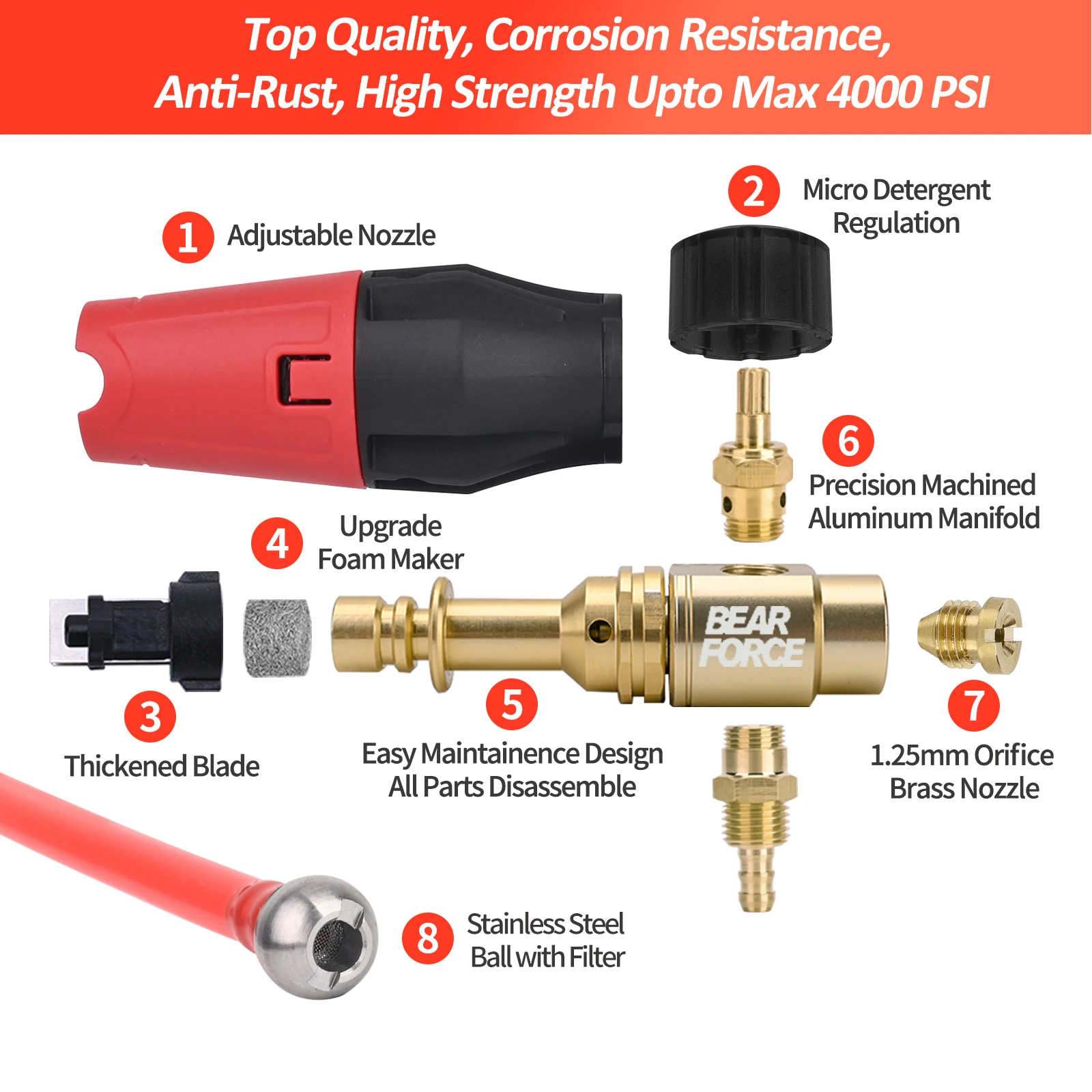 - It delivers a high maximum pressure of 3000 PSI (210 Bar), equipped with brass valve and stainless steel connectors for high performance and low vibration during operation.