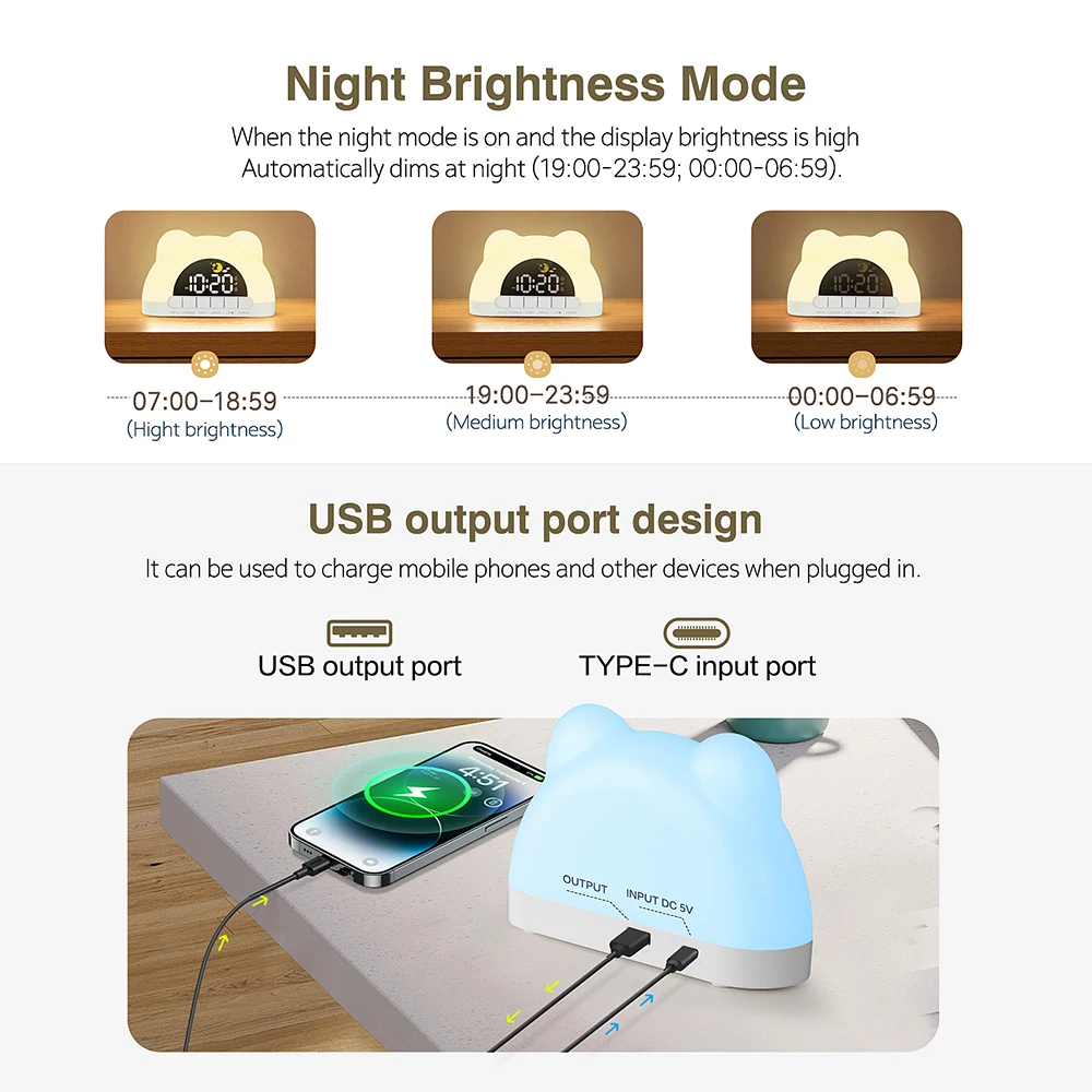 Experience a delightful blend of modern design and gentle awakening with this cute bear-shaped alarm clock. Made of smooth white plastic, its rounded, dome-like body mimics a friendly bear face with ears adding whimsical charm. The large, circular LED display at the center shows the time in crisp white digits on a black background, with charming icons of a crescent moon and stars suggesting sleep mode. Soft rainbow gradient lights emanate from the top, creating a cozy, colorful glow in hues of yellow, pink, green, and blue. This multifunctional clock combines an adorable aesthetic with practical features like dual alarms, adjustable brightness, and soothing sounds, making it perfect for bedrooms or any space that benefits from a cheerful yet calming vibe for waking or relaxation.