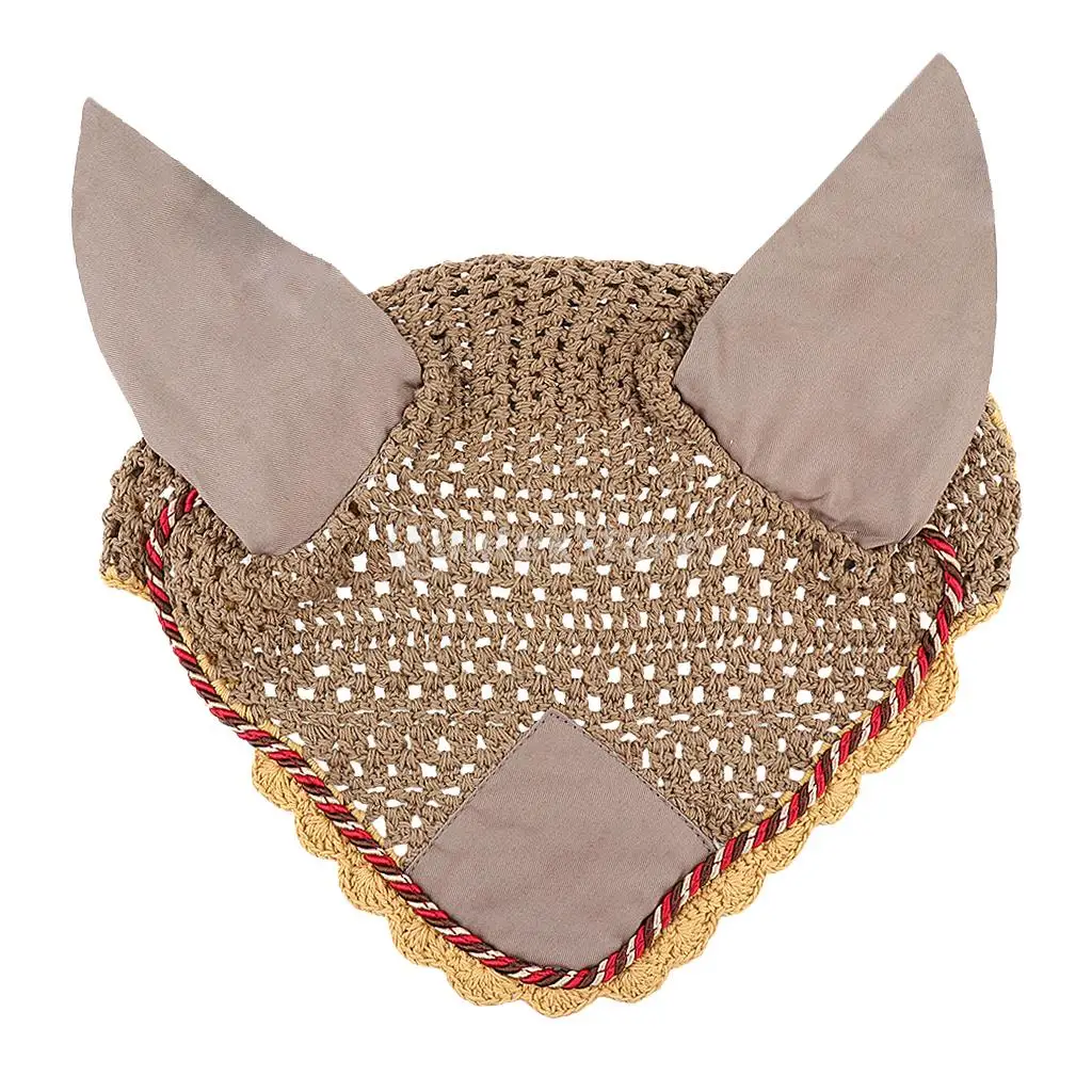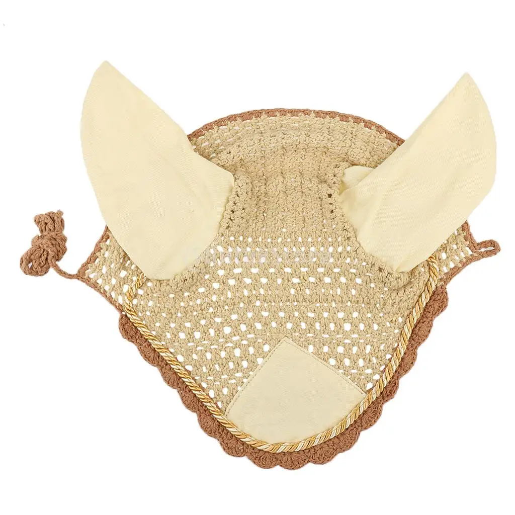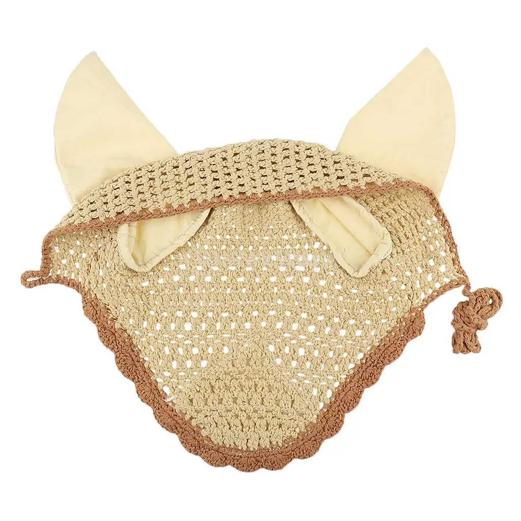 Experience comfort and protection with this beautifully handcrafted beige horse fly veil, designed to shield your horse from insects while adding a touch of elegance. Made from high-quality, soft cotton, this veil offers breathability and durability for daily use. Its hand-knitted construction ensures both style and resilience. The net front panel features tiny, evenly spaced holes that allow excellent ventilation, keeping your horse comfortable even in warm weather. The scalloped darker border adorning the finish adds a refined aesthetic. Large, pointed ear covers made from matching solid fabric provide a secure fit and extra protection. Whether during riding or turnout, this fly veil combines practicality with sophisticated style, making it a must-have for any attentive horse owner who values both function and fashion.