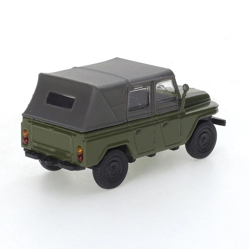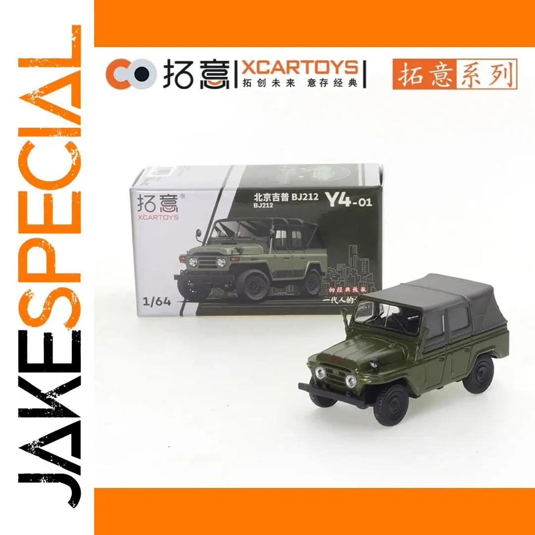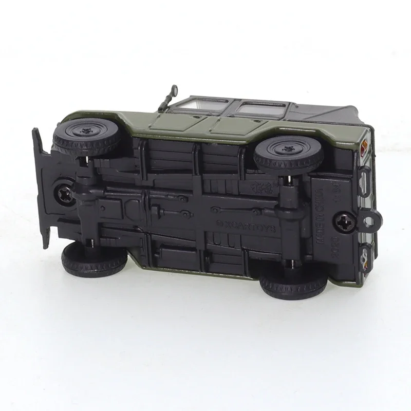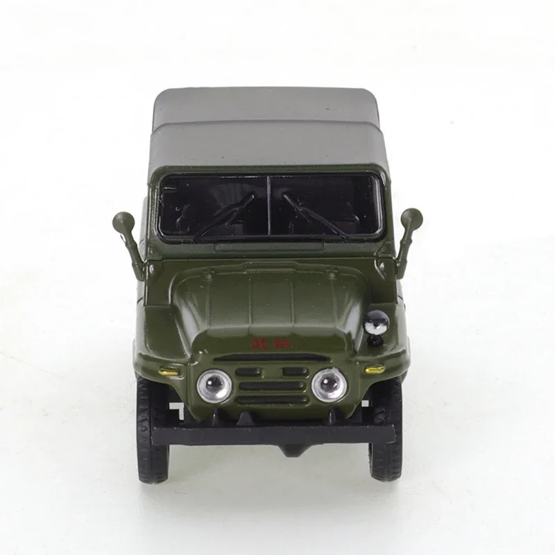 This 1:64 scale diecast model of a Beijing 212 Jeep in military-style green offers a highly detailed, realistic replica crafted from durable metal. The compact, boxy design features a prominent grille with horizontal slats, round headlights, and a smooth contoured hood. The transparent windshield and side windows reveal intricate interior details, while the black wheels feature textured hubcaps and treaded tires for added authenticity. Complemented by a soft, removable fabric or plastic cover with a textured finish, this vintage-inspired model combines rugged charm with craftsmanship suited for collectors and enthusiasts aged 14 and above. Perfect for display or role-playing, it captures the essence of classic off-road vehicles.