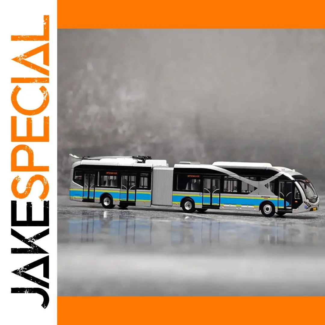 Discover this meticulously crafted 1/110 scale model of a dual-source trackless bus, designed to reflect the sleek, modern aesthetic of Beijing alloy buses. With dimensions approximately 16cm long, 2.3cm wide, and 2.9cm high, it offers a realistic representation perfect for display or collection. The model’s body features a luminous white finish, complemented by vibrant blue and yellow horizontal stripes along the bottom, adding lively accents. The black-tinted windows span the entire length, accentuated by slender black frames. Its alloy and plastic construction ensures durability and detailed craftsmanship, including small wheels with silver rims for authenticity. This static ornament is an ideal piece for enthusiasts seeking a high-quality, modern public transit replica.