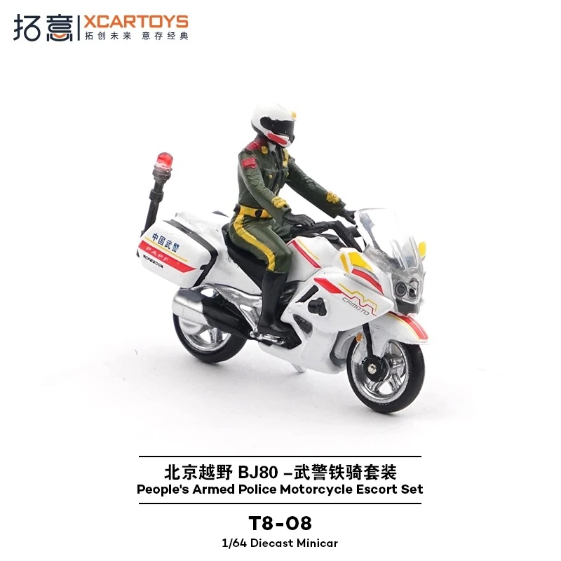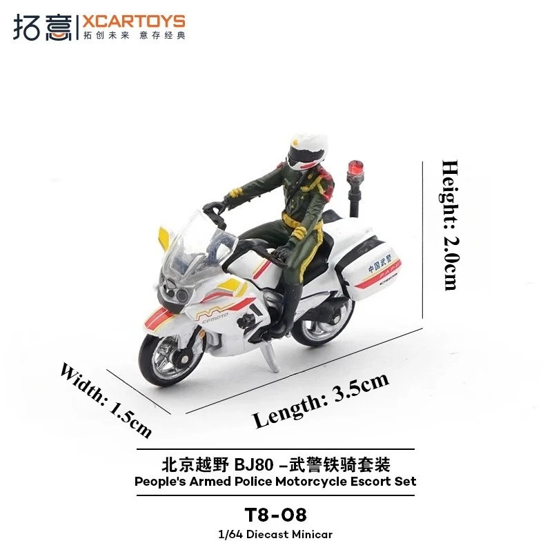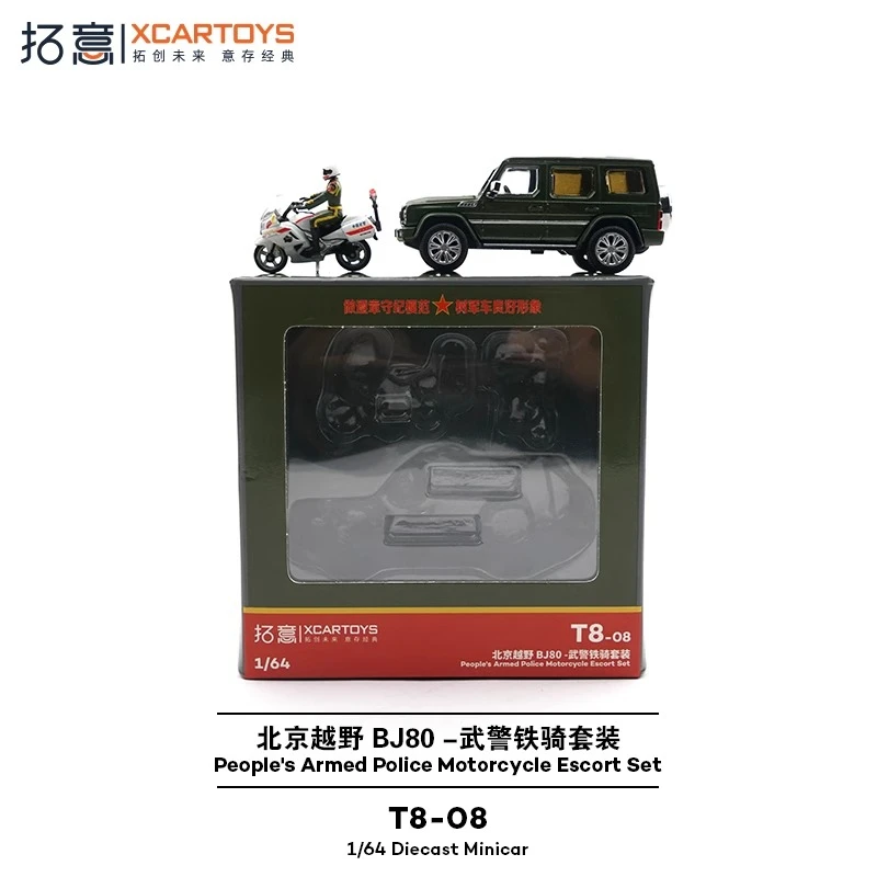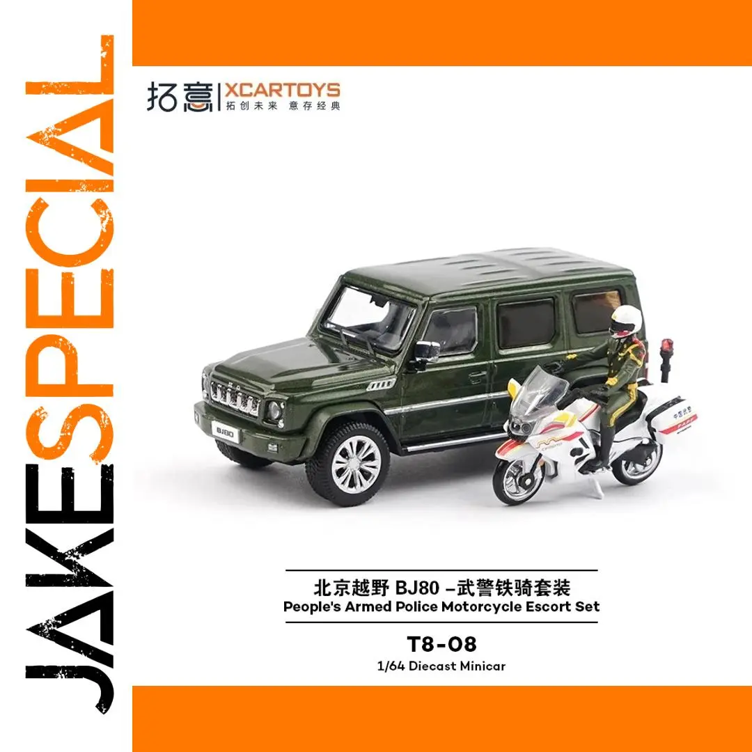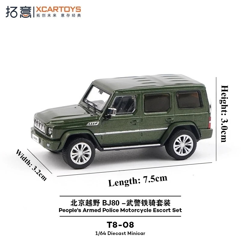 Experience the thrill of collecting this highly detailed 1:64 scale diecast model of the Beijing Off Road BJ80 Armed Police Cavalry set. Crafted from durable metal, this miniature captures the rugged essence of the original vehicle with precision. The dark green matte finish emphasizes its military-inspired design, featuring sharp, angular lines, a prominent grille with seven vertical slats, and realistic detailing on the headlights, windows, and tires. The accompanying police motorcycle, painted with vivid red and yellow stripes, adds a sleek, streamlined touch, complete with a large windshield and rear storage compartment. The police officer figure, dressed in a black and yellow uniform with a white helmet, enhances the authenticity. This collectible invites you to imagine scenes of tactical readiness, making it a perfect display piece for enthusiasts and collectors alike.