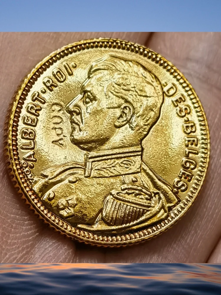 Imagine owning a beautifully crafted replica of the 1914 Belgium 20 Francs coin featuring Albert I. This item boasts a polished, shiny golden surface that gleams under light, capturing intricate details of the original design. The coin depicts a finely detailed profile portrait of Albert I, showcasing his facial features, hair, and military uniform with decorative elements. The surrounding inscription reads “ALBERT R. ROD.” on the left and “DES BELLIGERANTS” on the right, with a dotted border along the edge for added refinement. Its antique European style and meticulous craftsmanship make it a perfect collectible piece, ideal for history enthusiasts and coin collectors seeking a sophisticated decorative item with a touch of historical elegance.