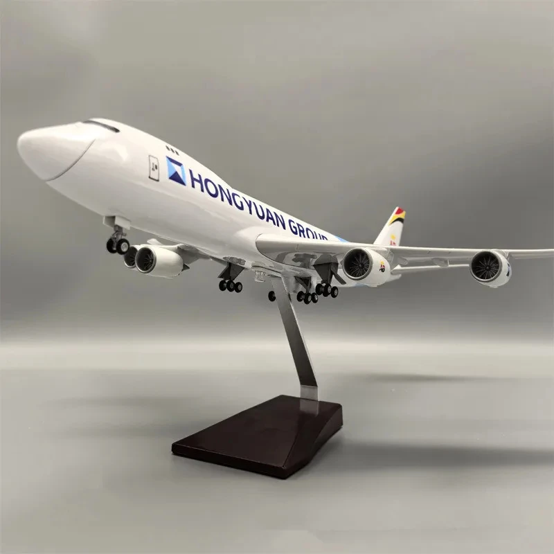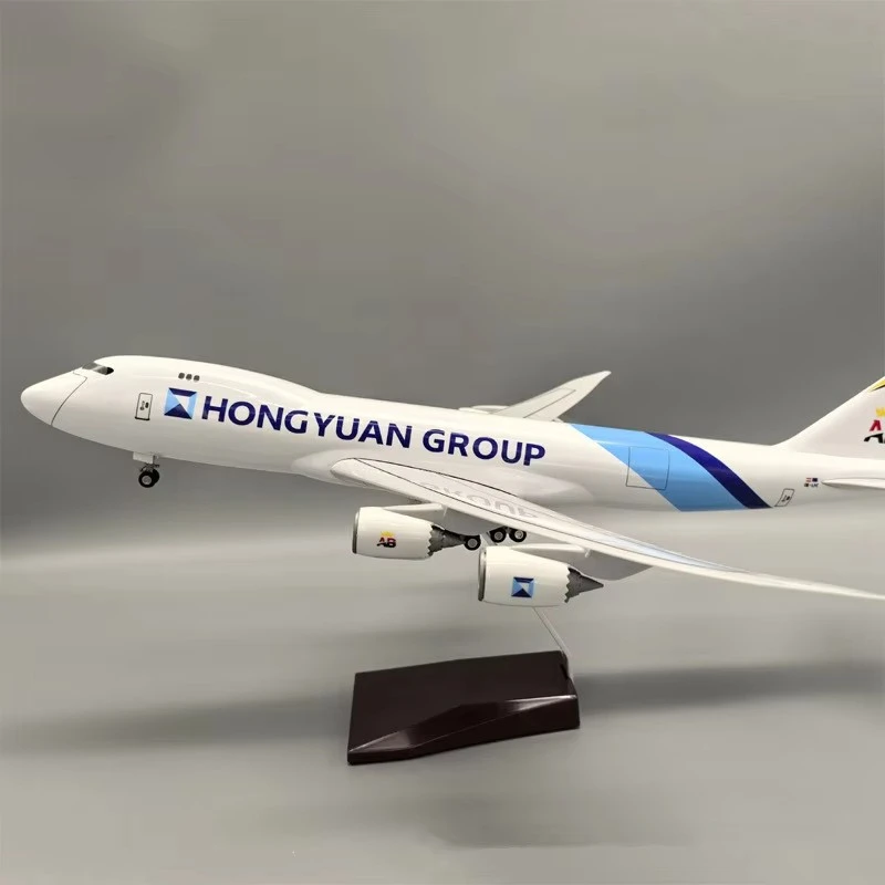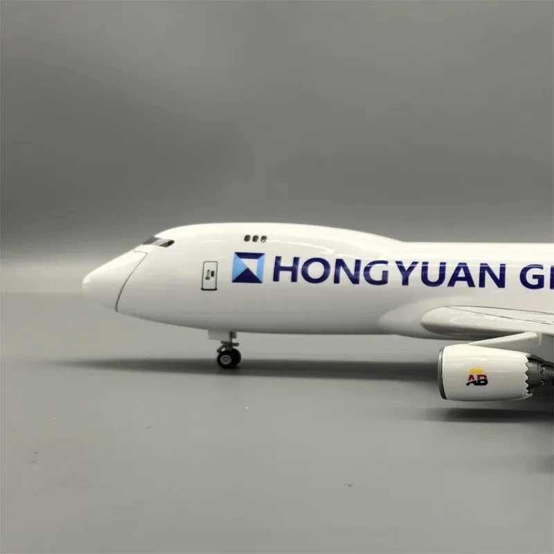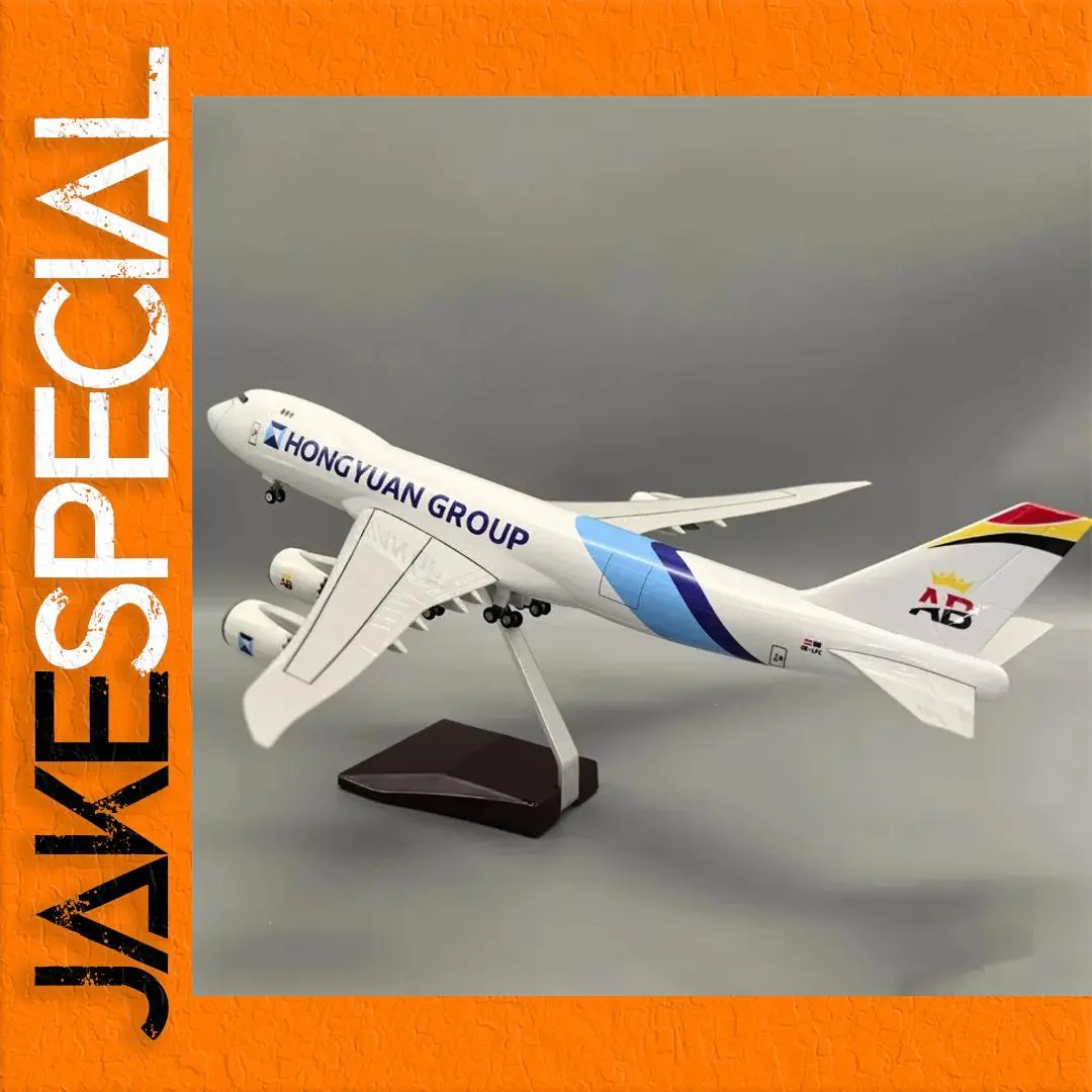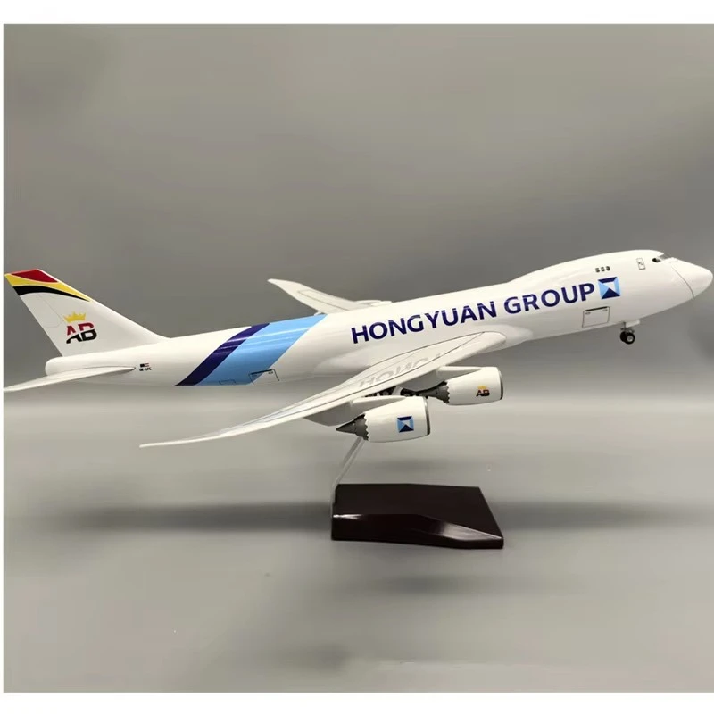 Imagine showcasing the stunning Resin Plane Model of the Belgian Cargo 747-8F in your collection, a beautifully crafted piece that measures 47 cm long at a 1/160 scale. The model, made from high-quality resin and alloy materials, features a glossy white finish and the bold “HONGYUAN GROUP” lettering that catches the eye. Its intricately designed upward curving wings adorned with blue accents deserve admiration, while the colorful tail emblem enhances its visual appeal. With detachable wheels and an elegant dark brown base, this model invites you to appreciate the elegance of aviation artistry as it adds a unique touch to your home or office decor.