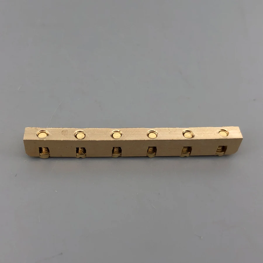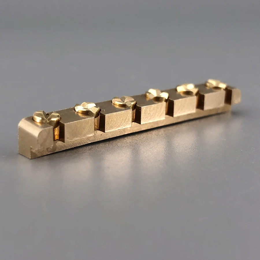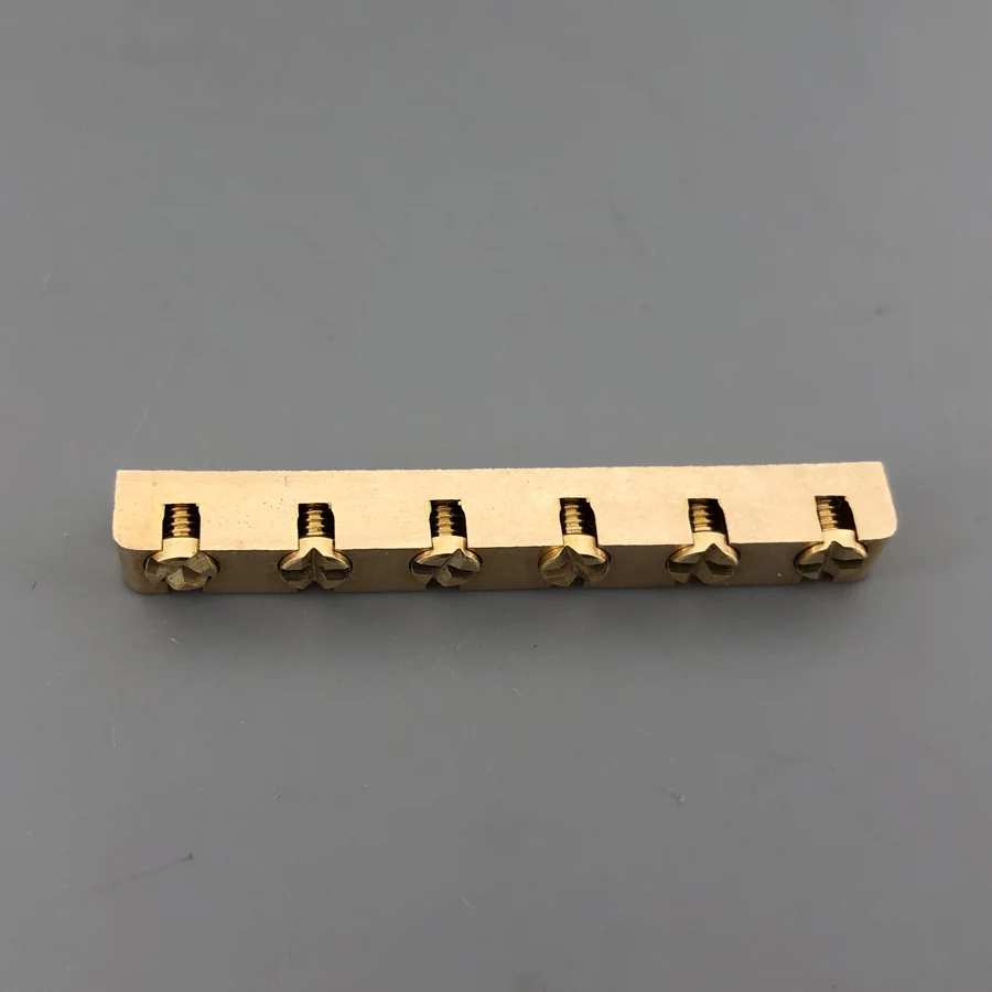 Imagine upgrading your electric guitar with this sleek, high-quality brass guitar nut, designed for precise tuning and enhanced durability. Its shiny, gold-like finish adds a touch of elegance to your instrument, reflecting craftsmanship and attention to detail. The compact, rectangular shape ensures seamless integration into your ST-style guitar, while the six evenly spaced adjustable saddles allow for customized string height and spacing. Whether you’re recording, performing, or practicing, this nut provides reliable performance and smooth string action. Its polished, corrosion-resistant brass construction guarantees longevity, helping you maintain optimal sound quality for years to come. Experience the difference that a meticulously crafted component like this can make in your guitar setup.
