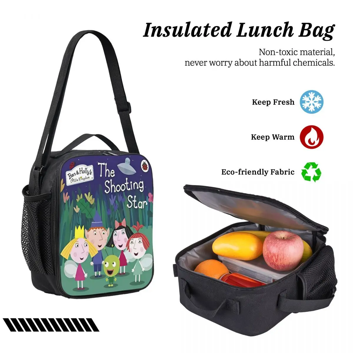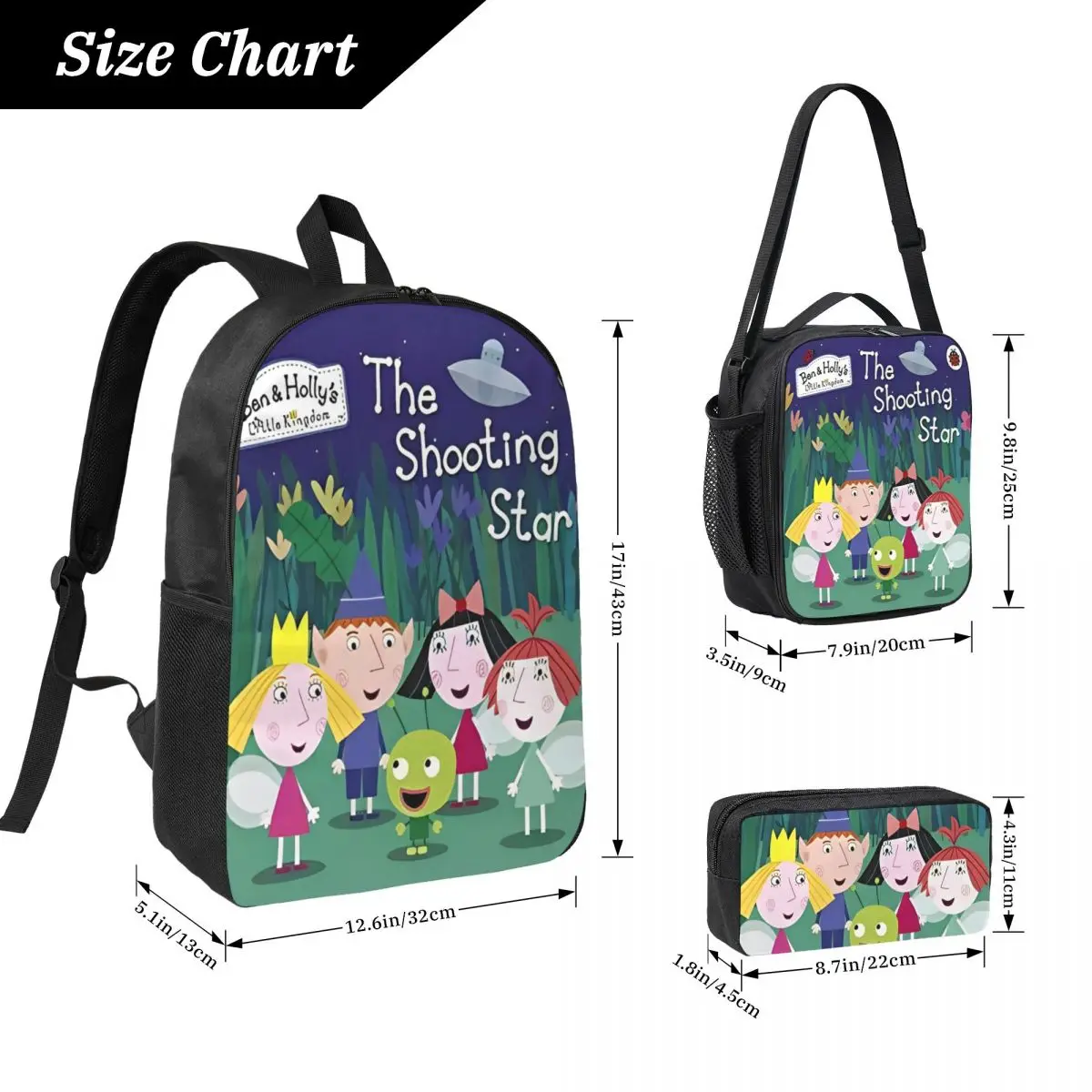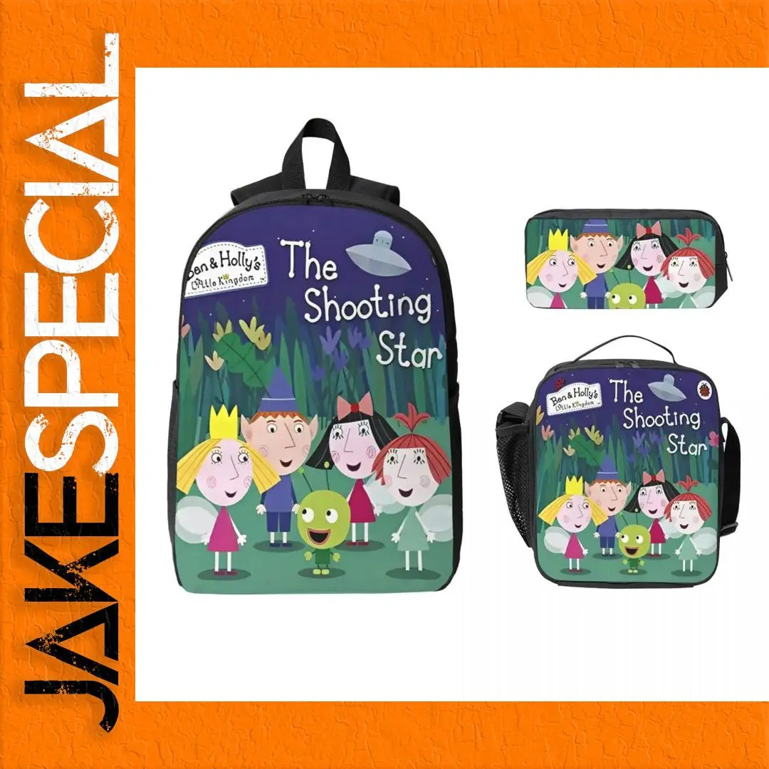 This delightful children’s backpack set features a vibrant deep blue backpack adorned with charming characters from “Ben and Holly’s Little Kingdom,” including a blonde boy, a girl with a yellow crown, and a whimsical green character. The phrase “The Shooting Star” and the logo are prominently displayed. Crafted from high-quality Oxford material for durability, the backpack includes black adjustable straps and a top handle. Complementing the backpack, the matching rectangular lunch box and elongated pencil case showcase the same playful design, making this set perfect for preschool adventures. Ideal for both boys and girls, this set ensures your little one’s essentials are stylishly organized.