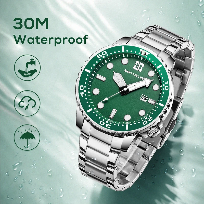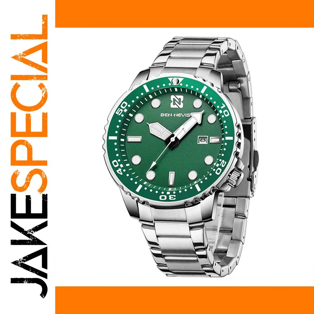 Experience the perfect blend of sporty style and practicality with this Ben Nevis BN3010 watch. Designed for dynamic individuals, it features a bold 46mm alloy case, complemented by a stainless steel strap and buckle for durability and comfort. The vivid green dial boasts a textured matte finish, with large luminous markers and sword-shaped hands outlined in silver, ensuring excellent visibility in any light. The unidirectional green bezel with white minute markers adds a touch of sophistication and functionality. Its mineral tempered glass protects the dial, while the sealed waterproof back cover and screw-down crown provide 30 meters of water resistance, suitable for daily activities. This watch seamlessly combines modern aesthetics with high-performance features that elevate your style and confidence every day.