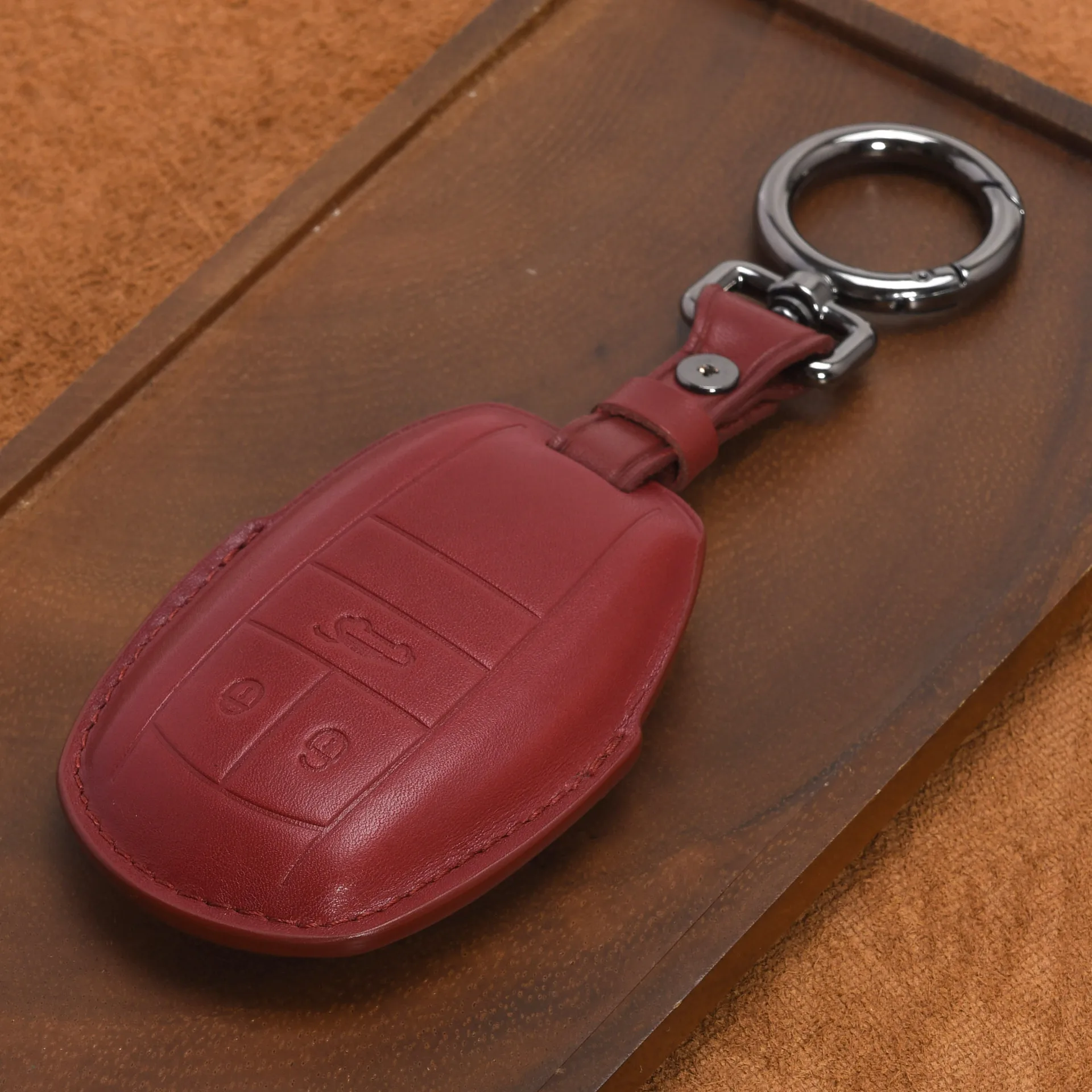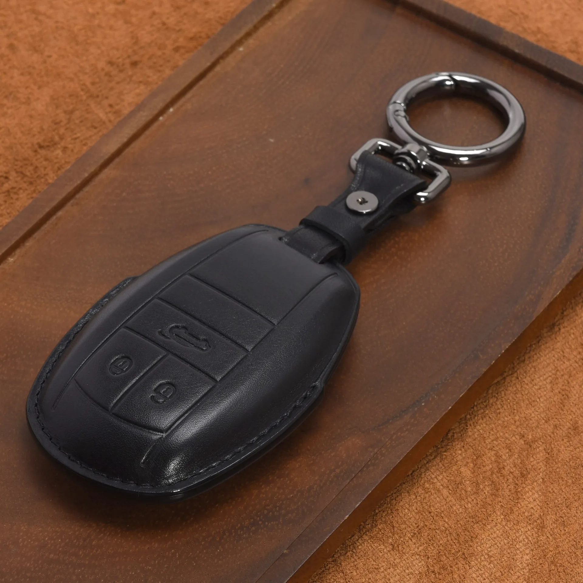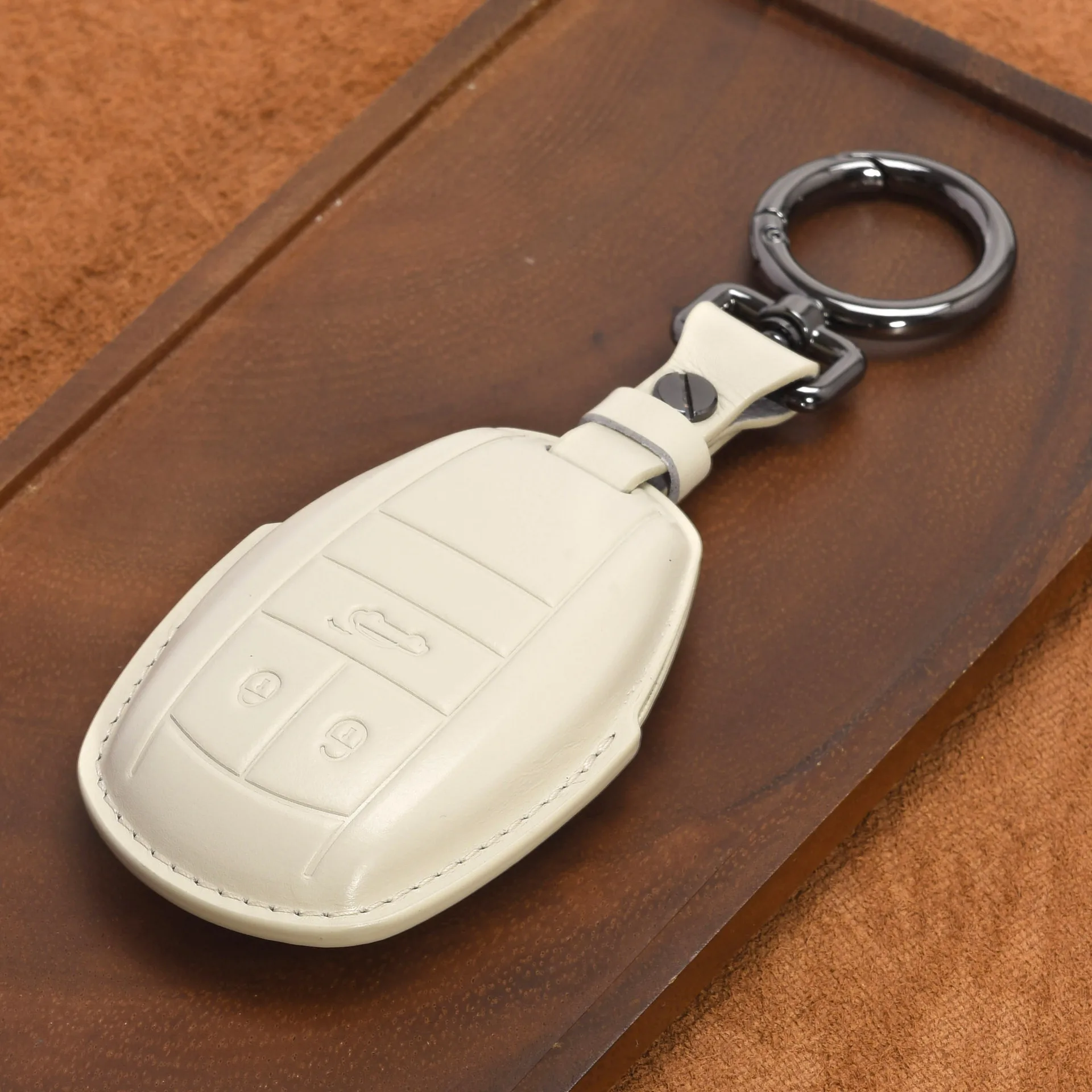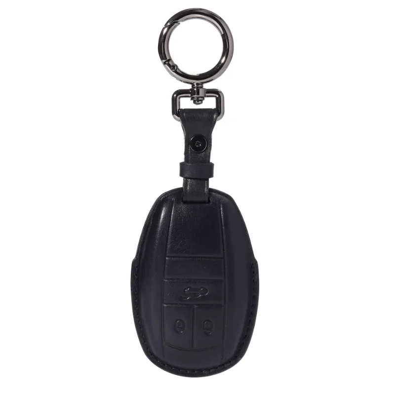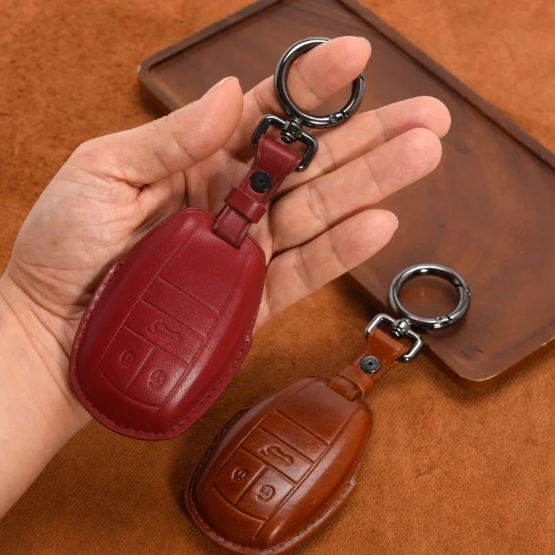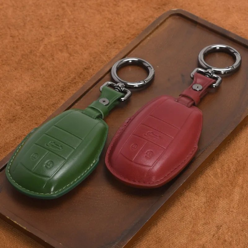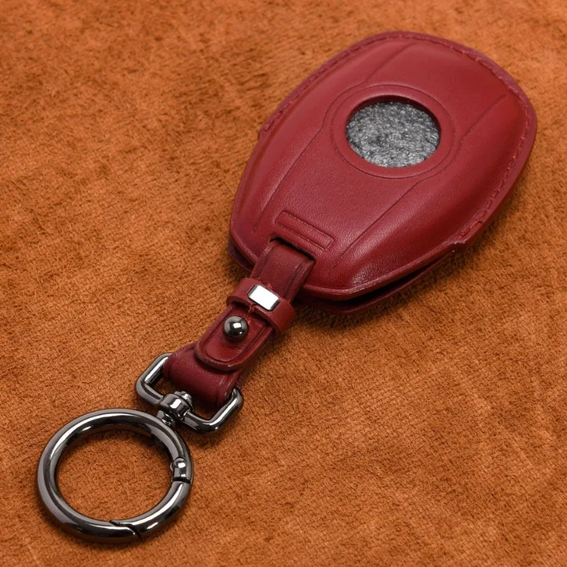 Elevate your key management with this premium leather key cover, meticulously designed for Bentley models, including the Bentayga SUV, Flying Spur, Continental GT, and Mulsanne. Crafted from top layer leather for exceptional quality and durability, this key cover is available in five elegant colors: deep black, rich green, glossy wine red, warm brown, and off-white. Each cover features a sleek car key-like design with rounded edges and structured button representations, ensuring a perfect fit for your keys. The inclusion of a metal keychain loop adds a touch of sophistication, making it an ideal accessory for the discerning Bentley owner.