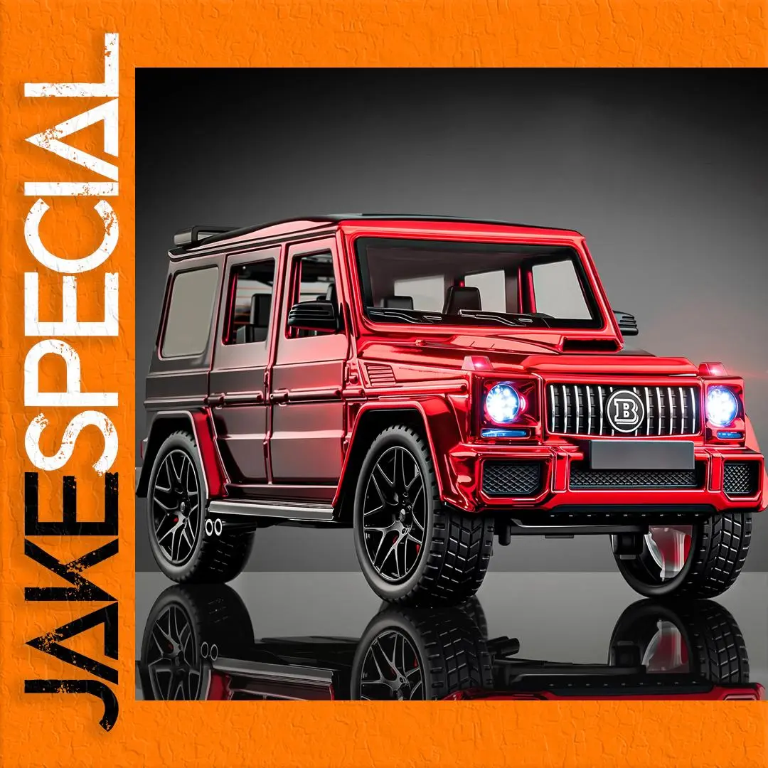 The 1:24 scale diecast model of the Benz G63 AMG SUV features a striking glossy red finish for a bold aesthetic. Crafted from alloy and plastic, this detailed collectible includes vibrant sound and light effects, enhancing its appeal. The classic boxy silhouette is complemented by rounded edges and prominent wheel arches, while the intricate black alloy wheels and realistic rubber tires provide authenticity. Clear windows reveal an interior that closely resembles the actual vehicle. Perfect for adult collectors and enthusiasts, this model captures the essence of the G63 AMG SUV in precise detail and vibrant color.