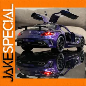 The 1:24 scale Benz SLS AMG Super Sports Car model is crafted from sturdy diecast metal, featuring an eye-catching vivid purple glossy finish with a glitter-like effect. It includes intricate details such as a prominently displayed Mercedes-Benz logo, realistic illuminated taillights, and gullwing doors that open to reveal a meticulously detailed interior with black and metallic accents. The sporty wheels showcase black rims with red highlights, and the exhaust pipes are precisely replicated. With sound and light functions powered by a button battery, this collectible model is perfect for enthusiasts and provides an exciting racing experience.