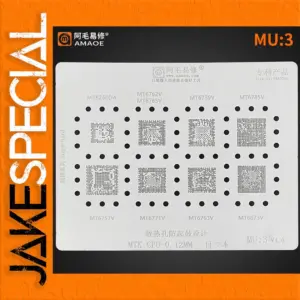 Crafted for precision electronic repairs, this this BGA reballing stencil features a sleek, white rectangular design with a highly organized grid pattern of tiny circular holes. Its minimalist, technical aesthetic is accentuated by clean lines, symmetrical layouts, and clearly printed labels, ensuring effortless identification and usage. Divided into four main sections, each labeled with specific model numbers, it allows technicians to work efficiently and accurately on compatible BGA components. The central QR code areas add a geometric touch while serving functional purposes. Made from durable materials with a 0.12mm thickness, this stencil offers consistent precision, making your reballing process more reliable and professional. The crisp, modern appearance supports a seamless workflow for electronics repair professionals and enthusiasts alike.