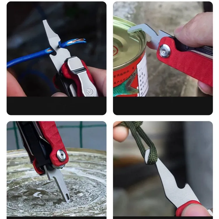 - This multifunctional tool includes scissors, screwdrivers, wrenches, a knife blade, and more, all integrated within a compact, foldable design for convenience and space-saving portability.