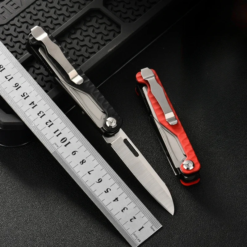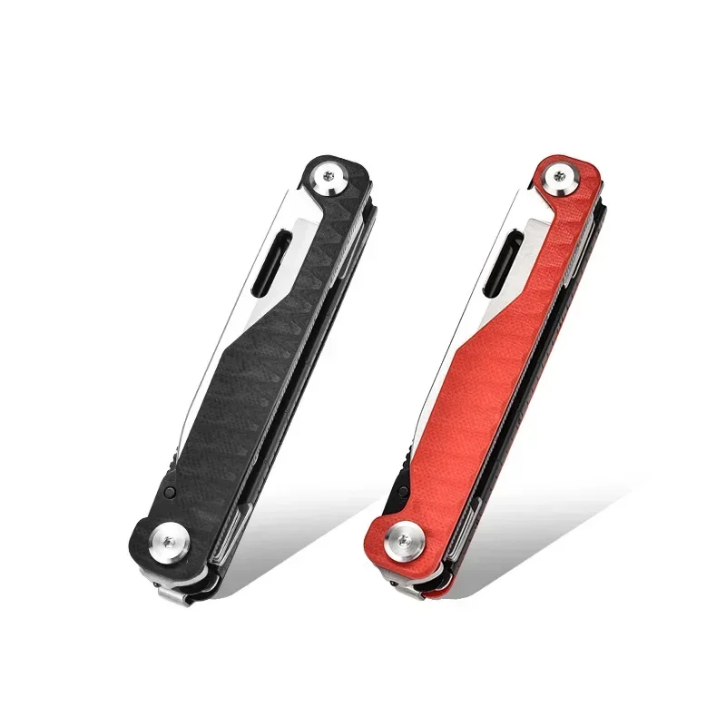- The handle includes a vibrant red section, providing excellent grip, control, and visual appeal, complemented by a sturdy pivot point with a visible screw for smooth folding.