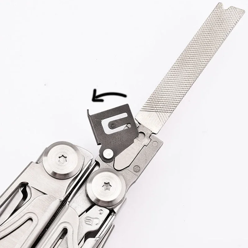 - This high-quality multitool boasts 37 functions, including pliers, screwdrivers, knives, scissors, and a replaceable saw blade, all packed into a compact, foldable stainless steel body for portability and ease of use.