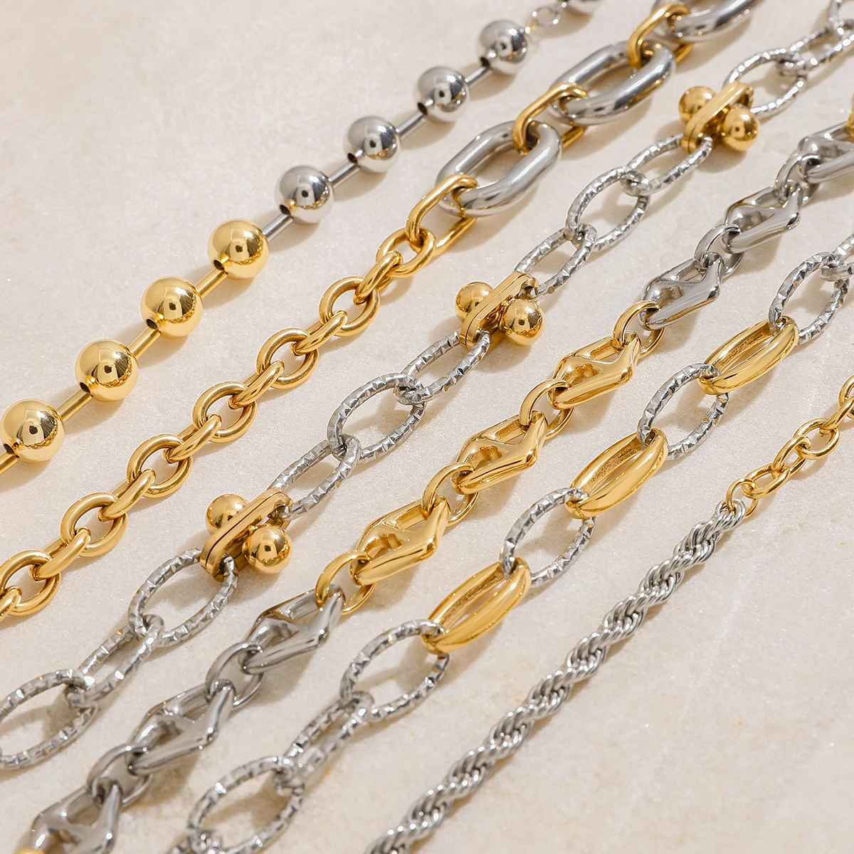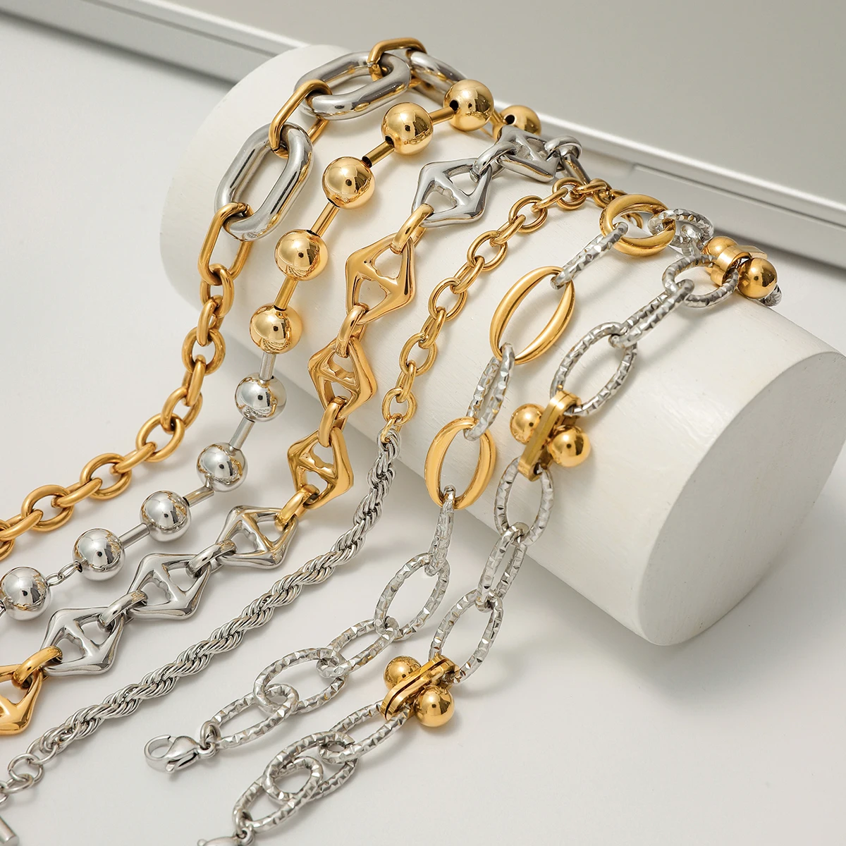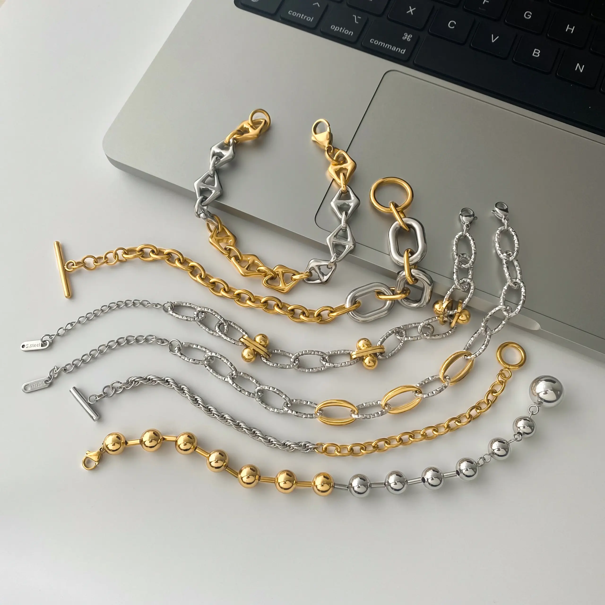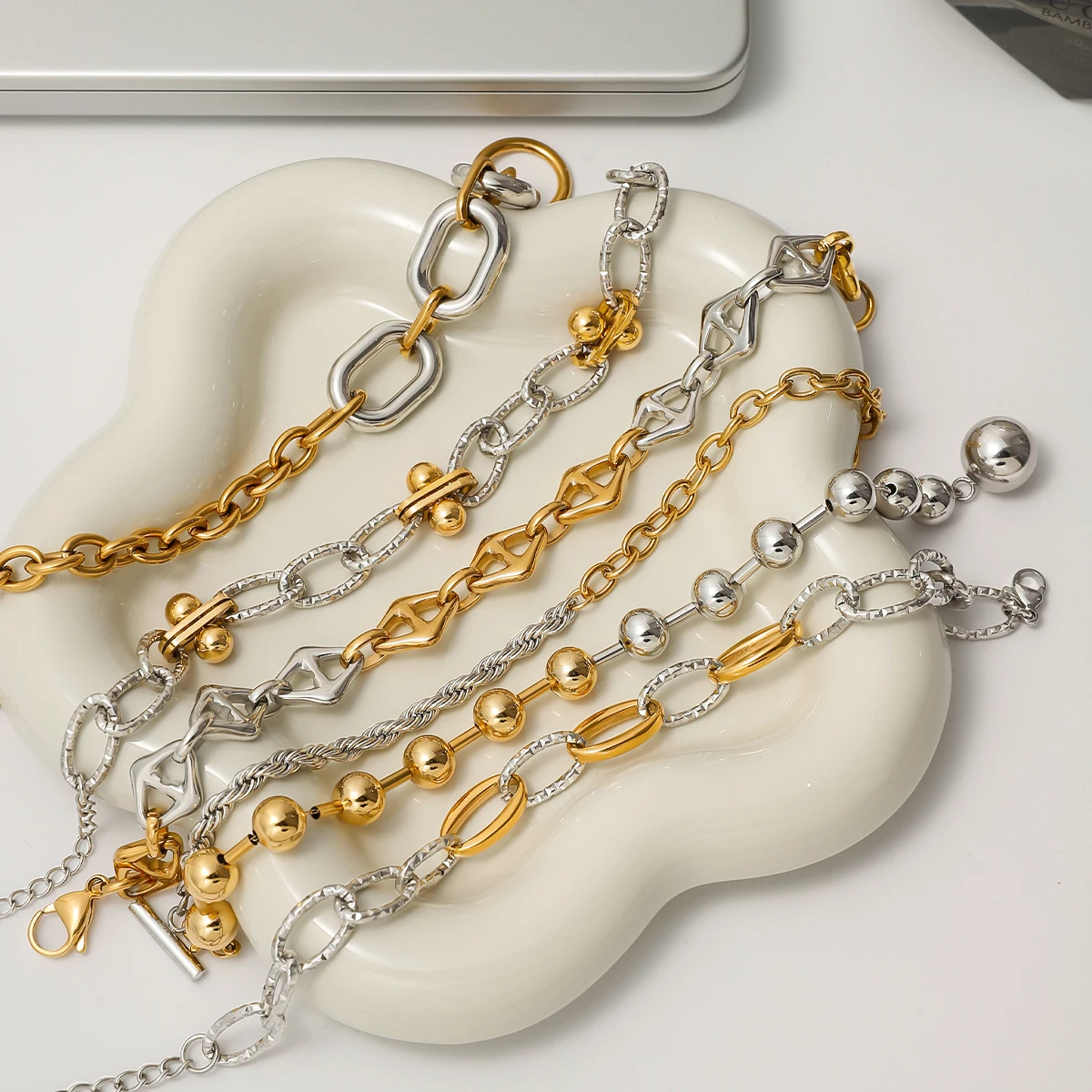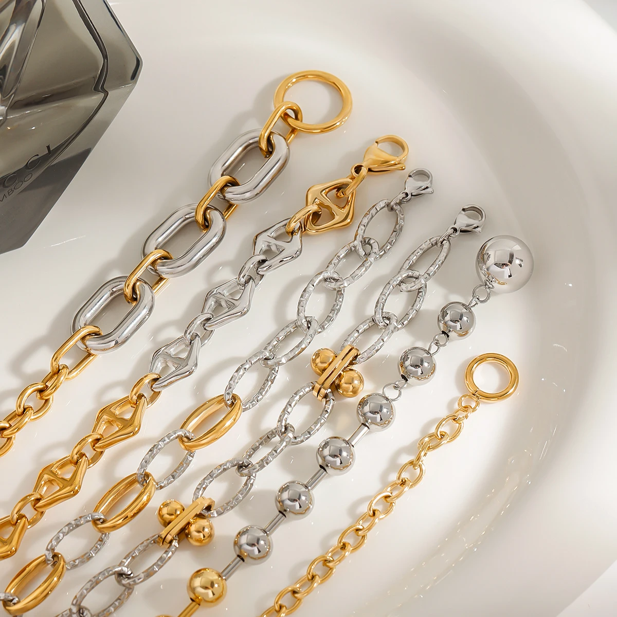 Elevate your style with this trendy bicolor stainless steel bracelet, model number JDB2406001-PS, featuring a bold link chain design with geometric shapes and a polished, glossy surface. Coated with durable PVD gold, it offers long-lasting color, resistance to fading and scratches, and a sleek, reflective finish. Weighing approximately 15 grams, it includes a secure lobster-claw clasp, is waterproof, hypoallergenic, and free from nickel, lead, and cadmium, making it suitable for all-day wear. Perfect for women who want a modern, fashionable accessory to enhance any outfit with confidence and style.