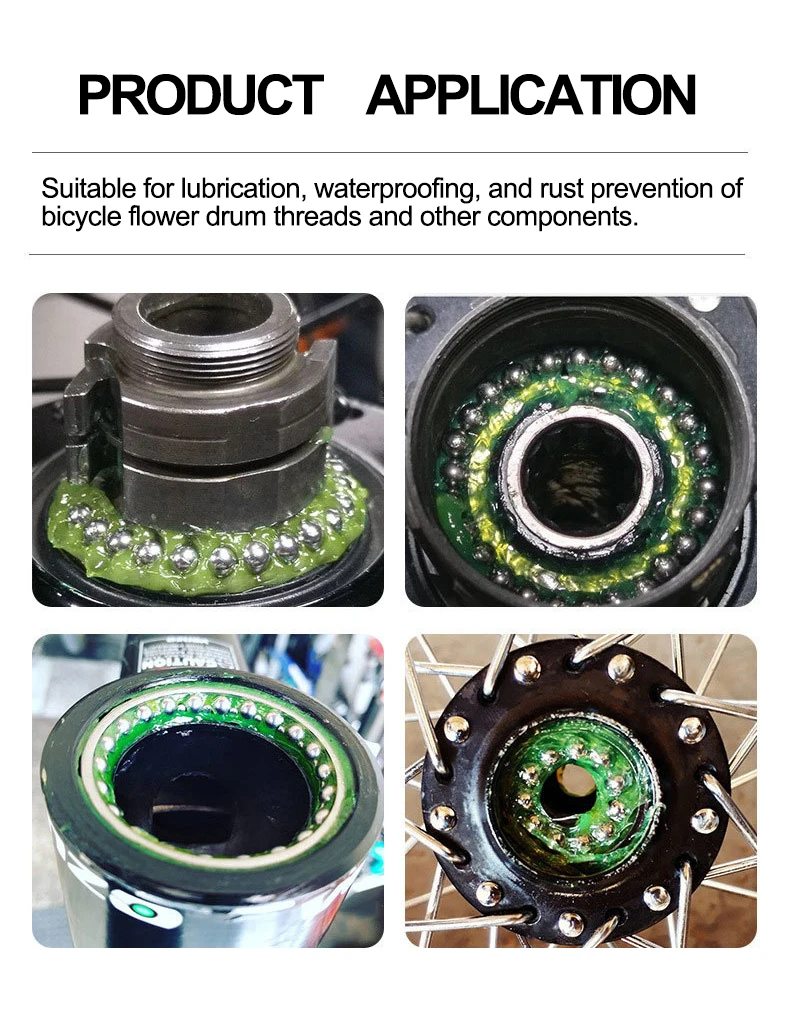 - Translucent green-yellow lubricant designed for medium and low-speed bicycle parts, ensuring excellent adherence and coverage on bearings, shafts, and pipeline linings for efficient maintenance.