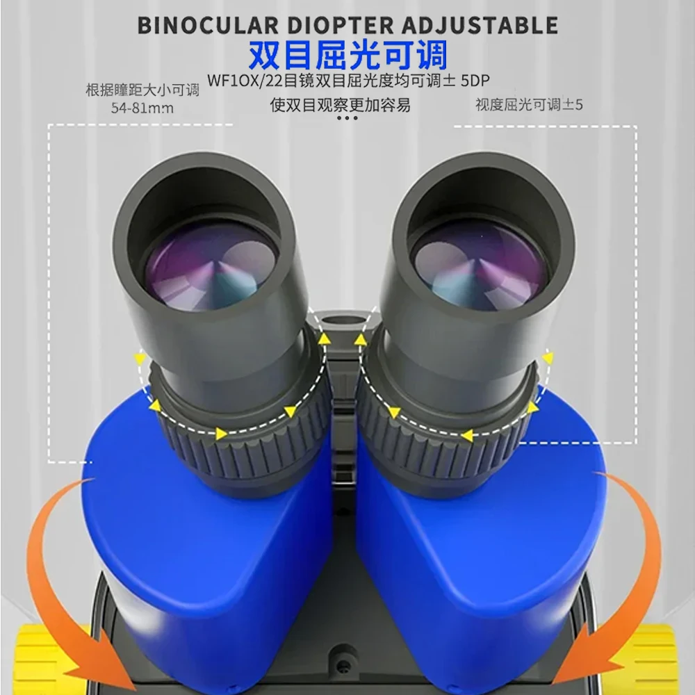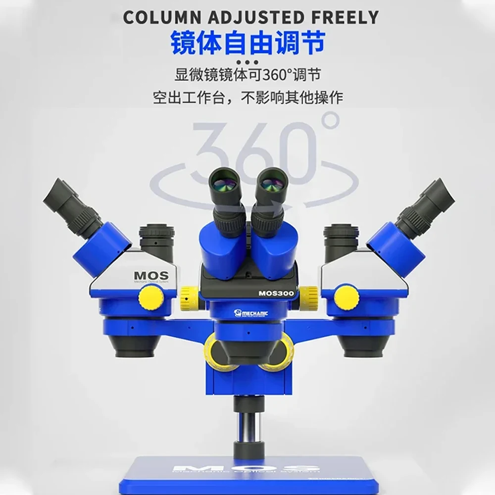 Experience precision and clarity with this stunning binocular/trinocular stereo microscope, models MOS260-B11 and MOS300-B11HD. Its sleek design features a vibrant blue and black color scheme, complemented by bright yellow adjustment knobs that add a touch of modern elegance. Crafted from durable aluminum alloy, the body offers a robust yet lightweight feel, ensuring long-term reliability. This instrument provides a versatile magnification range from 6X to 45X, with supplementary auxiliary lenses reaching 1.8X, and a smooth 0.6X to 4.5X continuous zoom for detailed inspections. The high-definition optics coated with a high-quality material ensure crisp, glare-free images, making it ideal for intricate work on PCBs, mobile phones, or computer motherboards. Its rotating body and ergonomic design promote ease of use for extended periods, elevating your workspace to professional standards.
