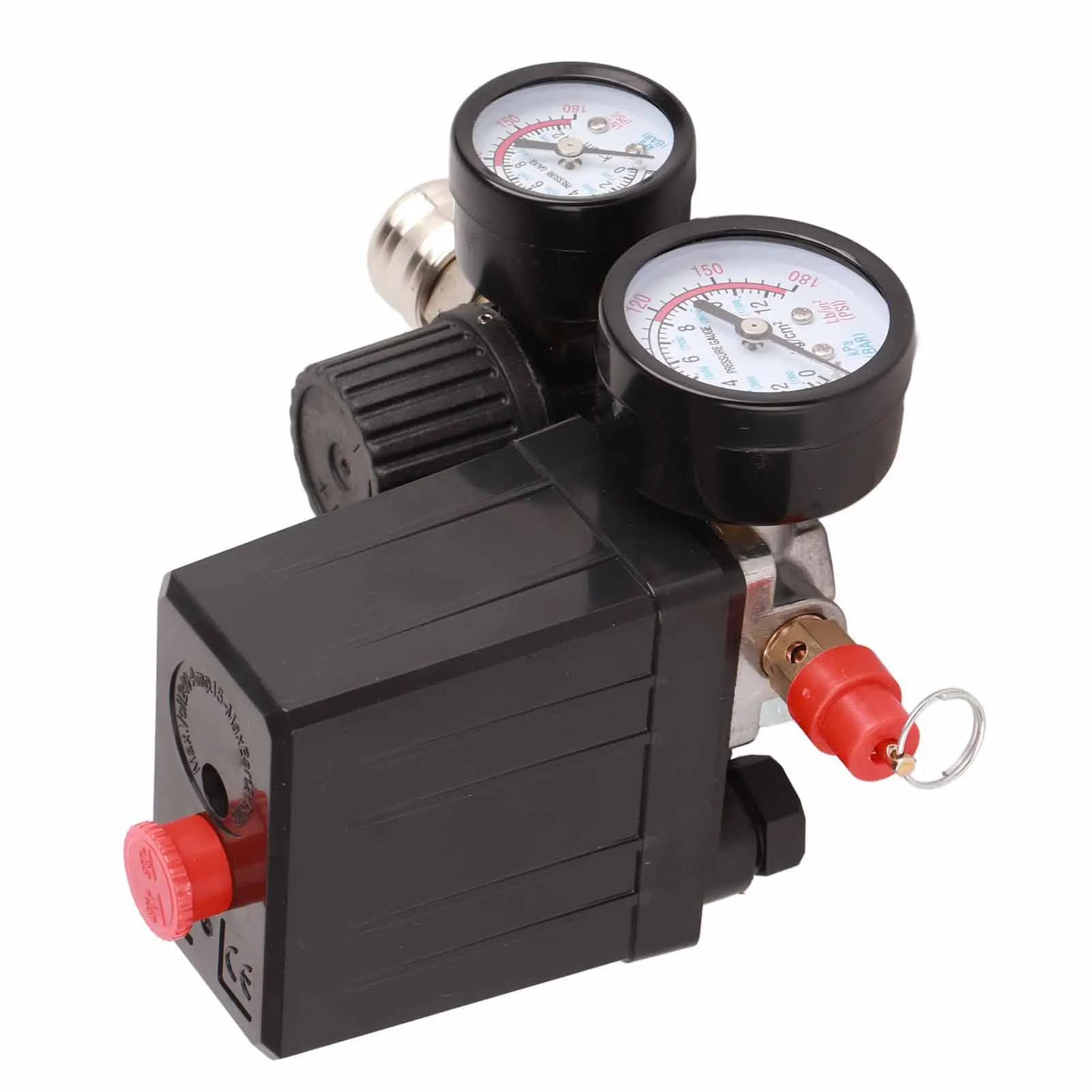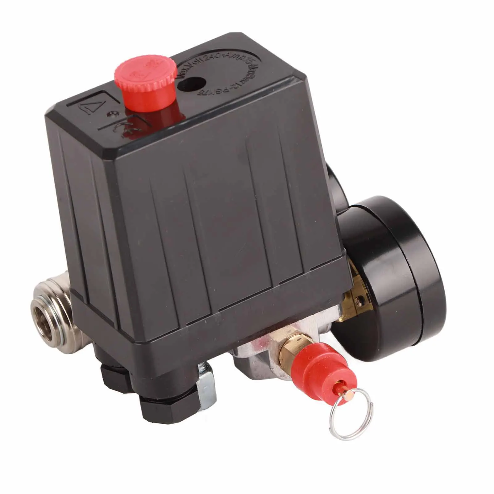 Enhance your air compressor setup with this black 1/4-inch pressure switch designed for precise control and reliable performance. Rated for 0.5-0.8 MPa (90-120 PSI) and operating at 220V with a maximum of 15A, it features high accuracy voltage regulation and a responsive on/off lever for easy operation. The switch includes a 6mm exhaust pipe, a 9.5mm relief port, and four-hole, 1/4-inch connectors for seamless installation in private workshops or industrial environments. Made from durable ABS and aluminum, with an impressive lifespan of up to 80,000 cycles, this compact, lightweight component ensures consistent pressure regulation and system safety.