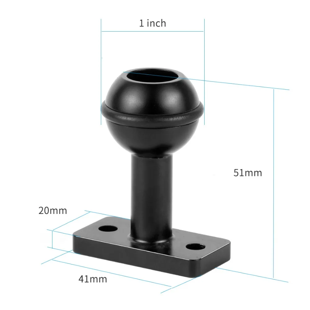 Enhance your camera setup with this sleek, durable black anodized aluminum ball head mount adapter. Designed for precision and stability, its 1-inch spherical head allows flexible positioning for action cameras, DSLR, and lighting devices. Its compact 50.2mm length, 40mm width, and 25.4mm height make it ideal for various applications, from underwater diving to outdoor shoots. CNC machined for high accuracy, the adapter features a sandblasted surface that offers an anti-slip grip, ensuring your equipment stays securely in place during dynamic activities. Easy to install with two included screws, it supports devices with two M5 tapped holes spaced at 27.8mm or M8 holes with additional screws (not included). This adapter combines style, function, and reliability for demanding environments.