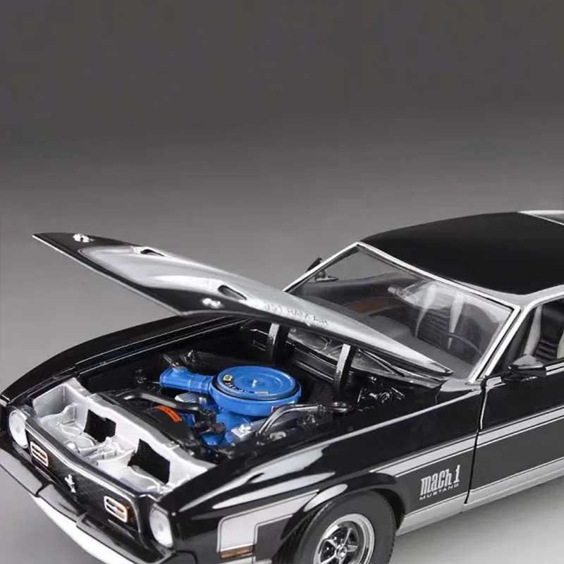 Experience the thrill of owning a beautifully crafted 1:18 scale Mustang Mach 1, meticulously designed to showcase the muscle car's iconic style. Crafted from alloy, plastic, and rubber, this model captures every curve and detail of the original, from the central hood scoop to the aerodynamic rear spoiler. The glossy black finish makes it a striking display piece, complemented by silver accents on the hood, sides, and rear. Its muscular lines and realistic multi-spoke alloy wheels bring a sense of power and sophistication. Perfect for collectors and enthusiasts, this detailed replica adds a touch of vintage automotive elegance to any collection or decor. Imagine the pride of showcasing this classic muscle car, completed with openable doors and linked steering for an authentic feel.