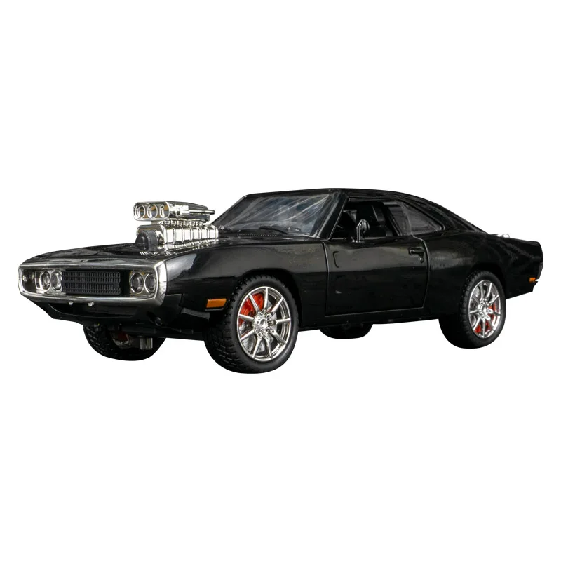 Experience the thrill of owning this detailed 1:24 scale diecast metal model of a sleek black Dodge muscle car. Featuring realistic functions such as steering, sound, and lights, it includes opening doors, engine hood, and trunk, perfect for detailed display and active play. The highly polished finish highlights its aerodynamic design, while the intricately detailed silver multi-spoke wheels with orange accents and textured rubber tires add to its authenticity. Fine details like tail lights, exhaust, side mirrors, and grille enhance its realism, making it an ideal collectible for enthusiasts who value craftsmanship and true-to-life features. Suitable for ages 6 and up.