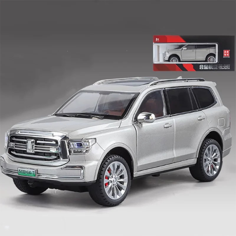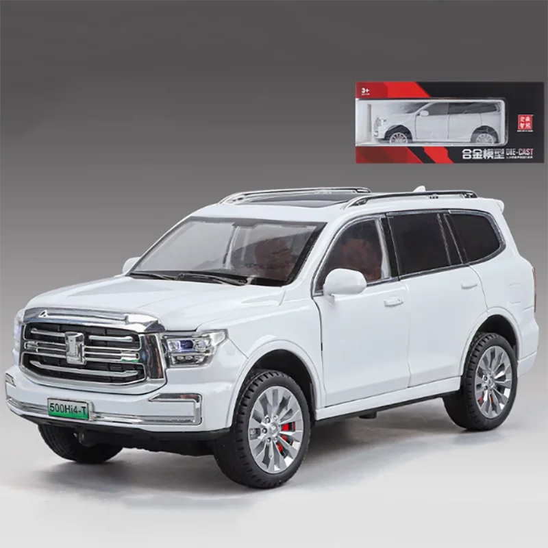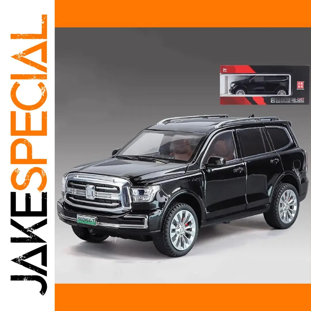 Experience the rugged elegance of this 1:24 scale diecast off-road SUV model, crafted from durable alloy metal. Its glossy black finish gives it a sleek, modern look, perfect for collectors and enthusiasts who appreciate detailed craftsmanship. The model measures approximately 21.2 centimeters long, 9.3 centimeters wide, and 8.3 centimeters high, embodying precision and realism in every element. Silver accents highlight the grille, bumper, and roof rails, adding a touch of sophistication. With transparent windows revealing an intricate interior, realistic door handles, side mirrors, and textured off-road tires with flared wheel arches create an authentic rugged aesthetic. This static display piece is ideal for showcasing your passion, whether on a shelf or as part of a collection. It’s a captivating reminder of adventure and craftsmanship, perfect for anyone who loves detailed miniature vehicles.