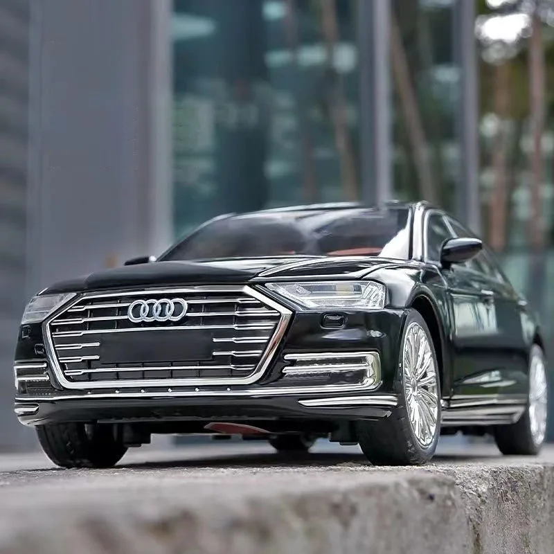 Experience the refined craftsmanship of this high-detailed, 1:24 scale diecast A8 model in sleek black. Perfect for collectors or as a sophisticated gift, this model captures the luxury of the original vehicle with meticulous design elements. Its aerodynamic silhouette features precisely molded lines, chrome accents along the windows and rear bumper, as well as realistic multi-spoke alloy wheels with textured rubber tires. The rear highlights the signature taillights with red lenses, clear sections, complemented by a subtle integrated spoiler and prominent badging. Transparent windows and detailed side mirrors add to the premium, highly realistic appearance. With sound and light features, this model brings a touch of realism and elegance to your collection or display.
