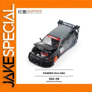 Imagine adding an ultra-realistic miniature of a sleek black racing supercar to your collection. This precisely detailed 1:64 scale diecast model captures the dynamic and aggressive essence of a high-performance EG6 supercar. Its aerodynamic shape features a low-profile front bumper, subtle contours, and a raised hood revealing silver and red engine components, reflecting pure racing power. The transparent windshield and side windows offer a peek into the intricately crafted interior. A bold black rear wing spoiler with “CWC” and a white graphic decal with a black outline on the side enhance its racing aesthetic. The pronounced wheel arches and custom orange hubs make it a striking, collector-worthy piece, emphasizing craftsmanship and realism.