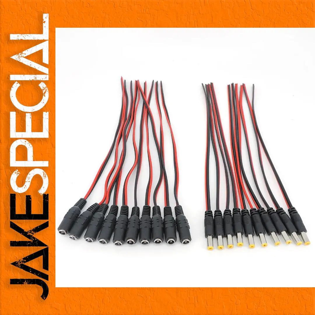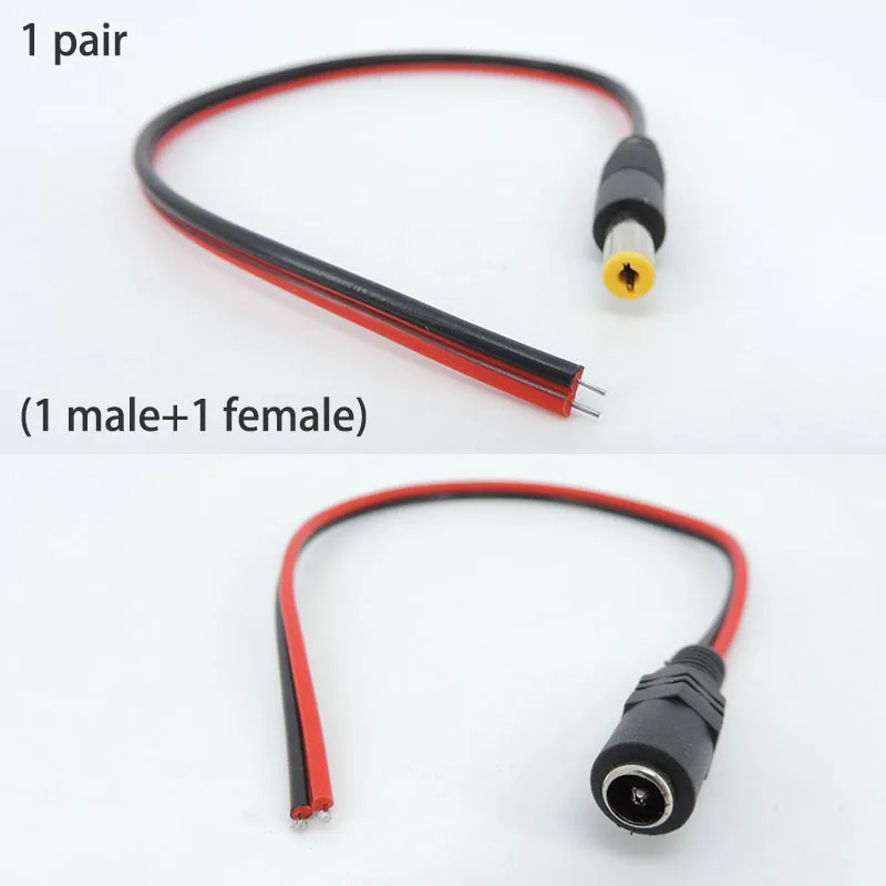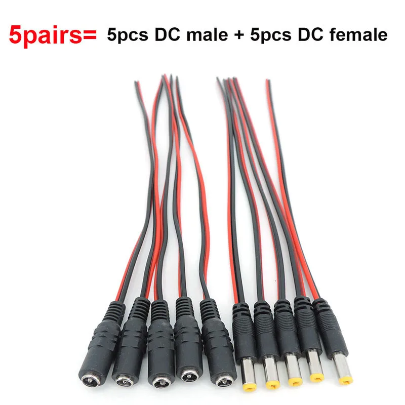 This 25cm extension cable features a sleek black design with a compact, rounded DC male or female plug with a 5.5×2.1mm connector, ideal for LED drivers, strip connectors, and CCTV cameras. Crafted from copper wire, it supports a maximum current load of 2A at 12V and transmits voltages from 1V to 38V. Available in various set configurations including 1 pair, 5 pairs, or multiple DC female or male connectors, the cable offers a practical, organized, and minimalist appearance. Both connectors have a matte finish and insulated red and black wires, ensuring durability and quality in various power extension setups.