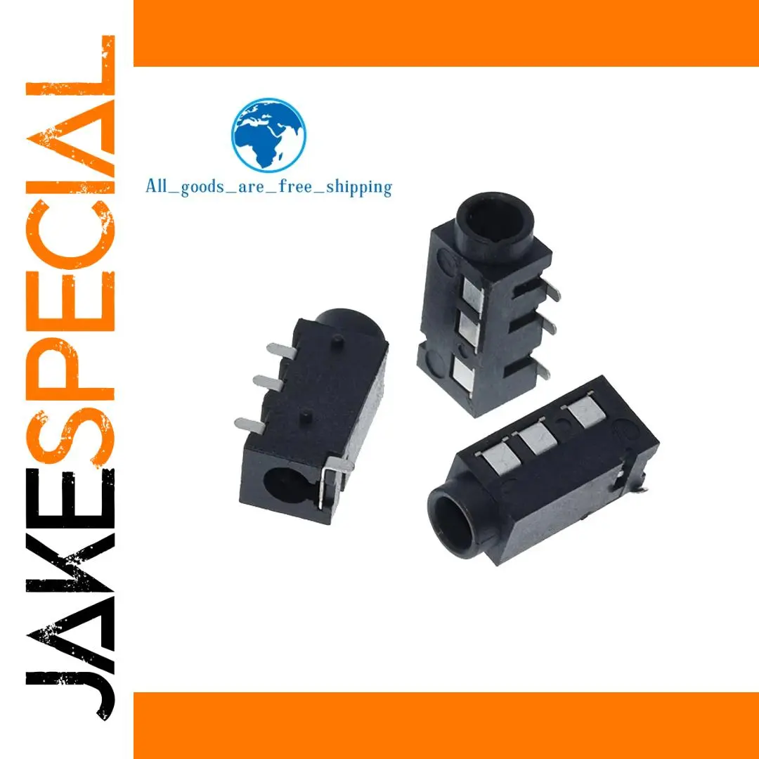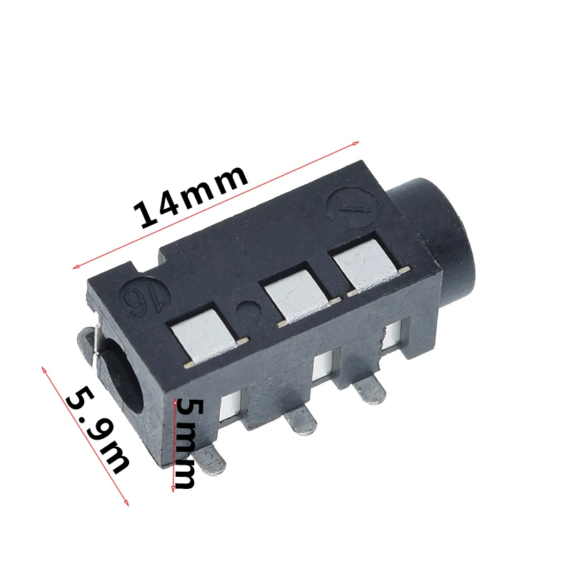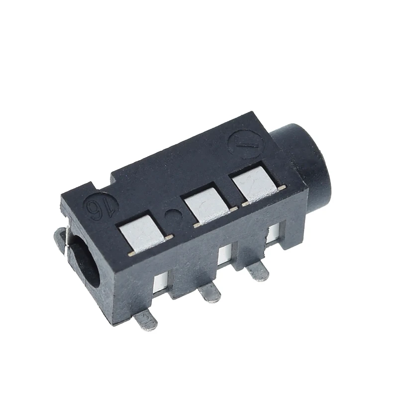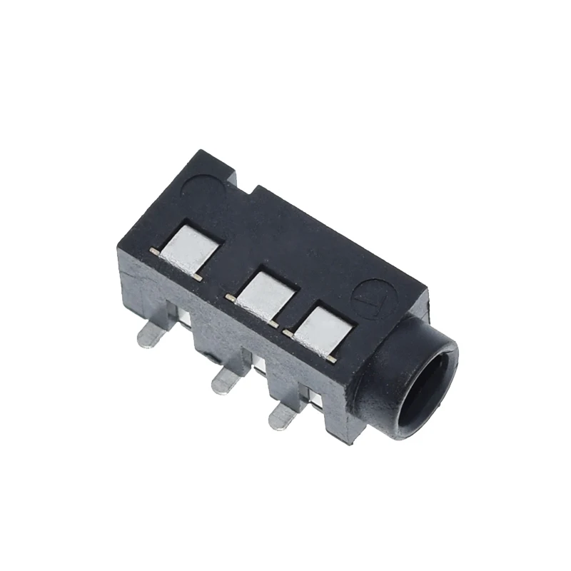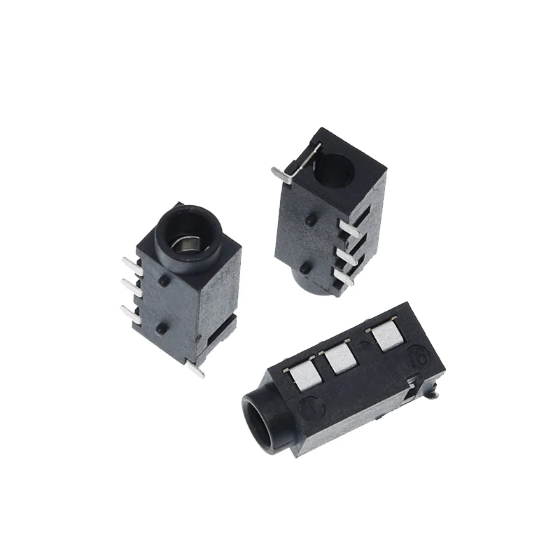 Experience seamless audio connections with these sleek, black plastic headphone jacks designed for reliable performance. Crafted with a modern, minimalist aesthetic, each connector features a matte-finish rectangular housing with subtle indentations for a refined look. The cylindrical openings accommodate standard 3.5mm headphone plugs, providing a clean contrast against the dark casing. Four shiny metallic pins extend from the side, ensuring secure surface mounting onto your circuit board. Compact and lightweight, these connectors are perfect for integrating into audio equipment, MP3 players, and custom electronic projects. Their durable, industrial design combines functionality with aesthetic appeal, making them an ideal choice for professional and enthusiast applications alike.