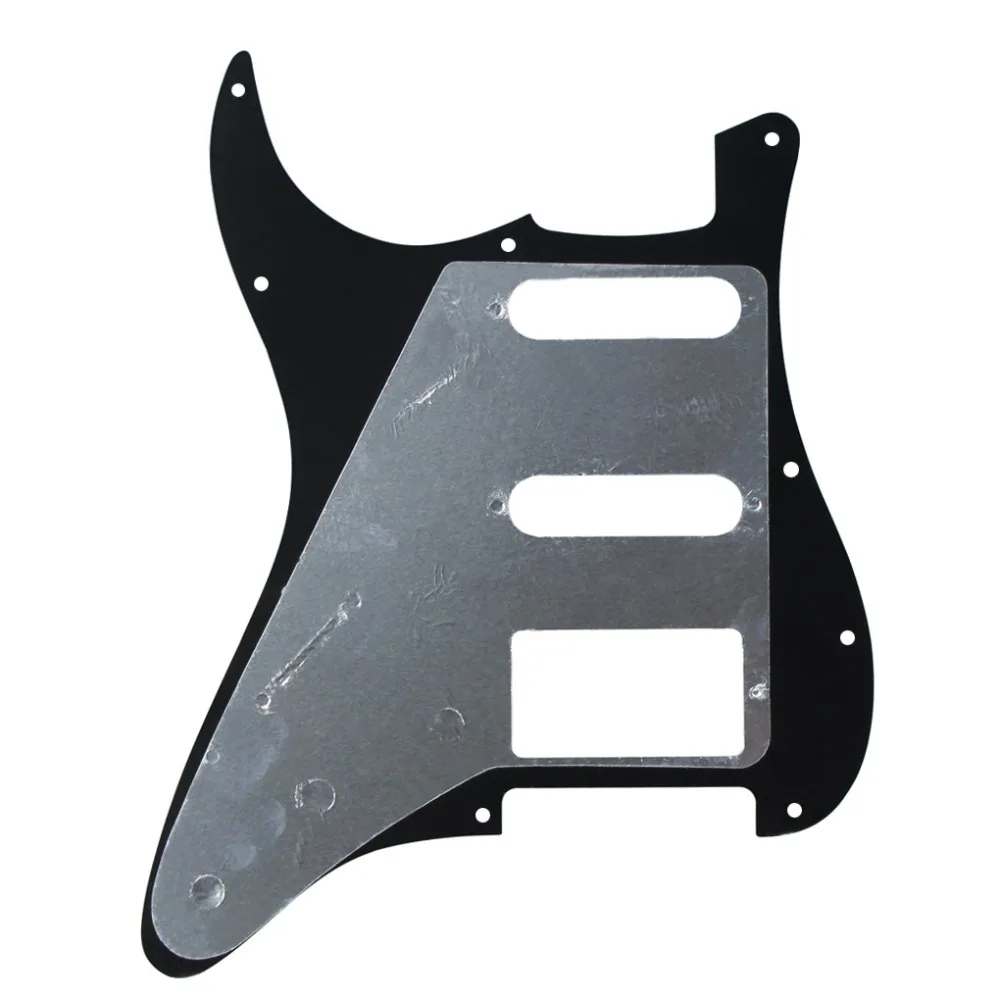 Transform your guitar with this sleek, black, three-layer PVC pickguard designed for ST, SSH, and HSS styles. Its durable construction ensures long-lasting performance, while the environmentally friendly materials make it a safe choice for any enthusiast. The pickguard features a modern asymmetrical shape with a sharp, pointed upper horn and a rounded lower contour, adding a bold aesthetic to your instrument. Crafted with precision, it includes multiple cutouts and 11 mounting holes for easy installation on most American and Mexican standard Fender-style guitars. The smooth beveled edges and protective film layer give it a polished finish. Plus, the aluminum foil shield at the back provides excellent interference protection, enhancing your playing experience with cleaner sound quality.