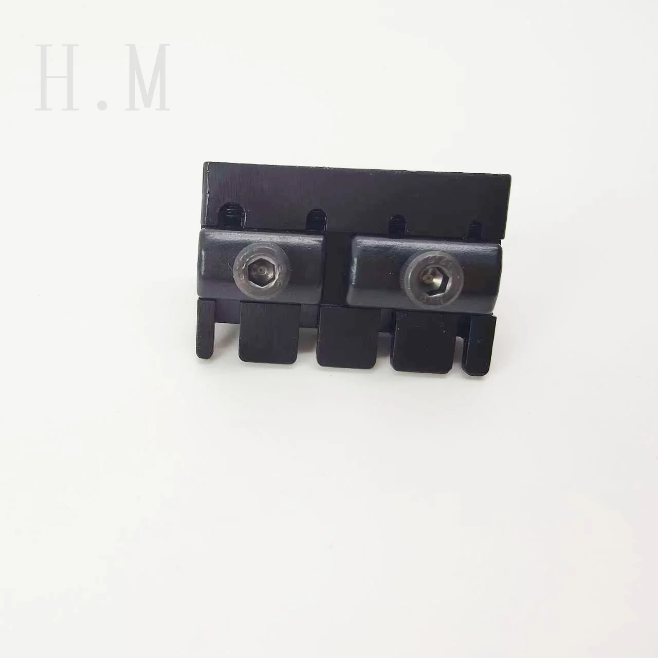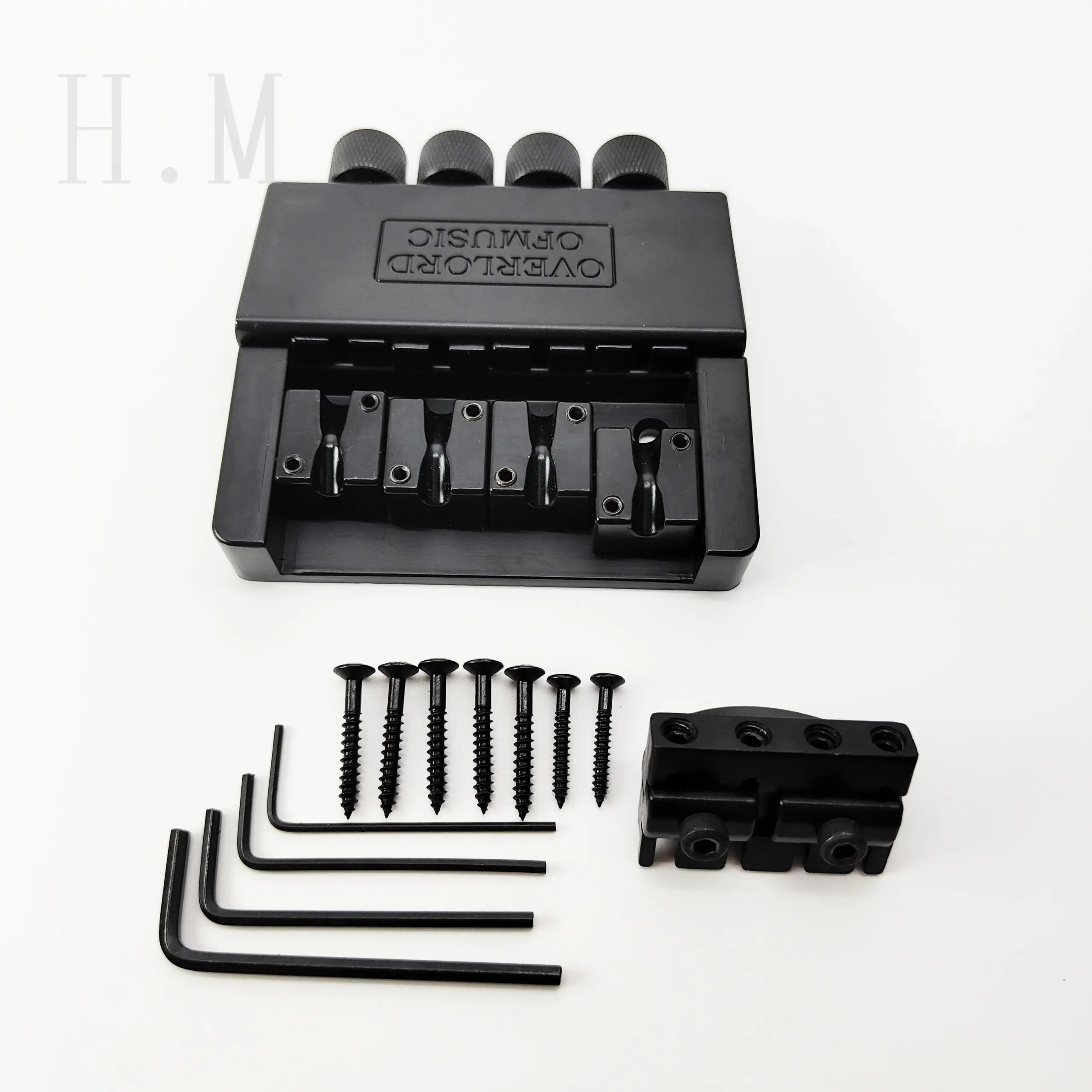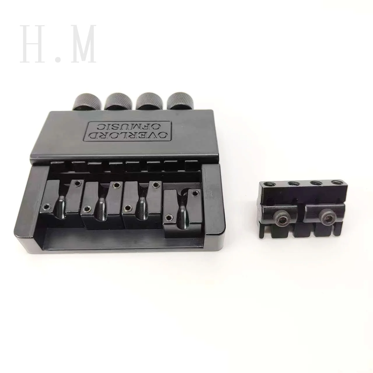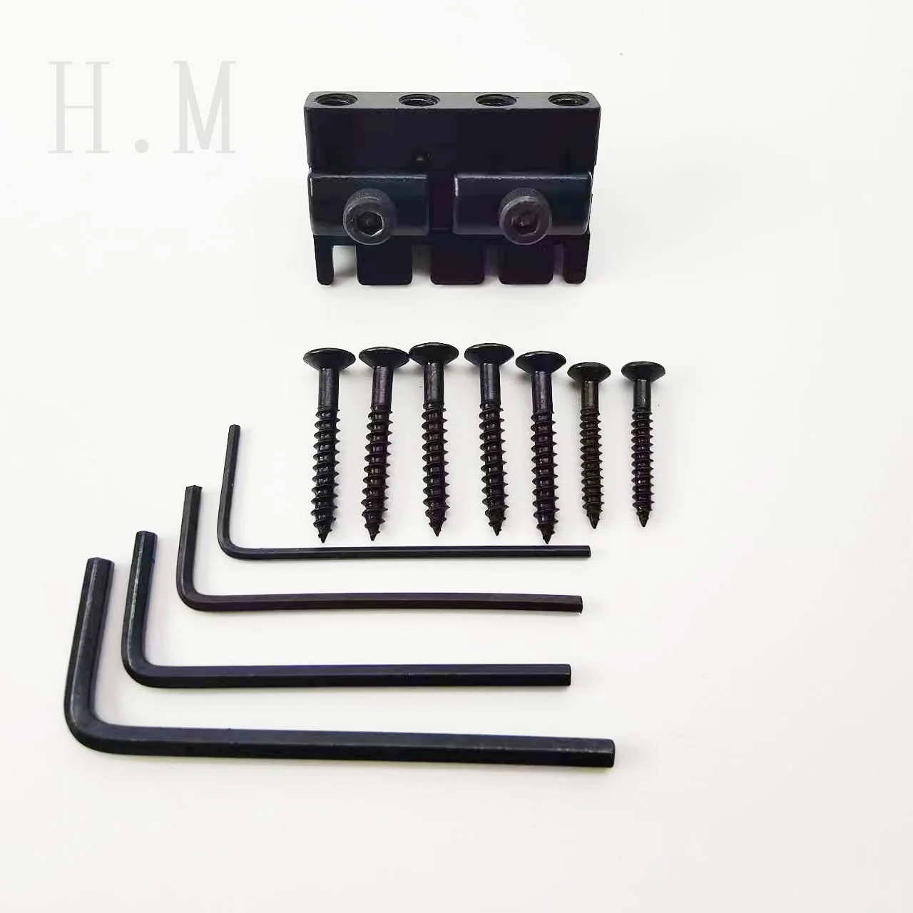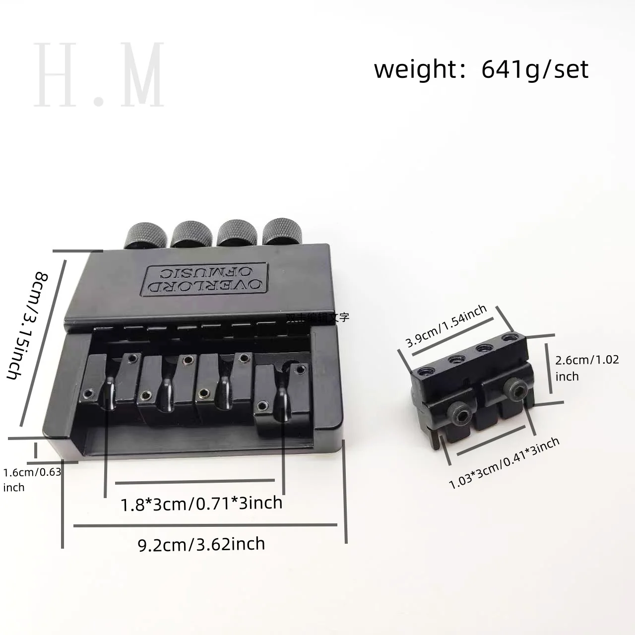 Experience precise tuning and enhanced stability with this high-quality black electrophoretic coated bass bridge set. Crafted from durable zinc alloy, it features a minimalist, modern design that complements any electric bass guitar. The rectangular main bridge measures 95mm by 92mm and stands 19mm high, providing robust support for four individual saddles, each curved with small grooves for secure string placement. The subtle branding on the raised section adds a professional touch. This set includes a pillow, four hex wrenches of different sizes (M1.5, M2.0, M2.5, M3.0), and seven screws, ensuring all you need for a seamless installation. Perfect for upgrading your instrument or custom builds.