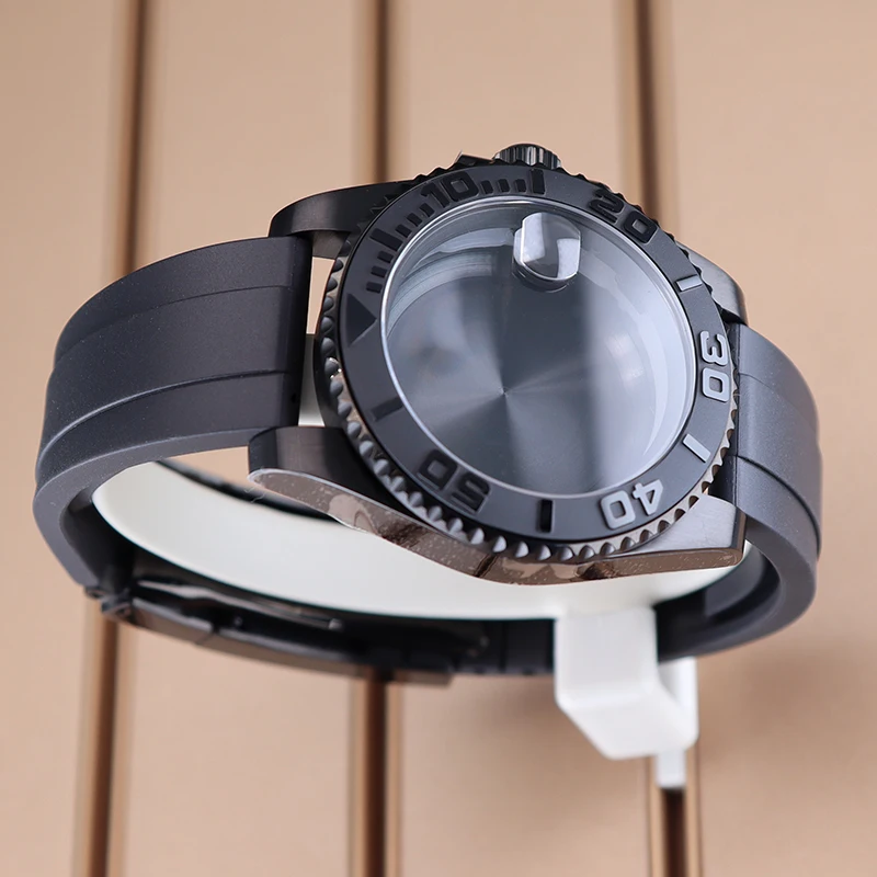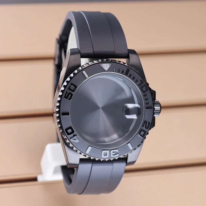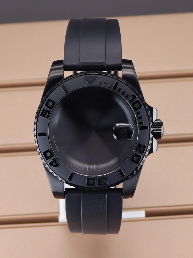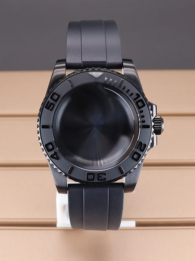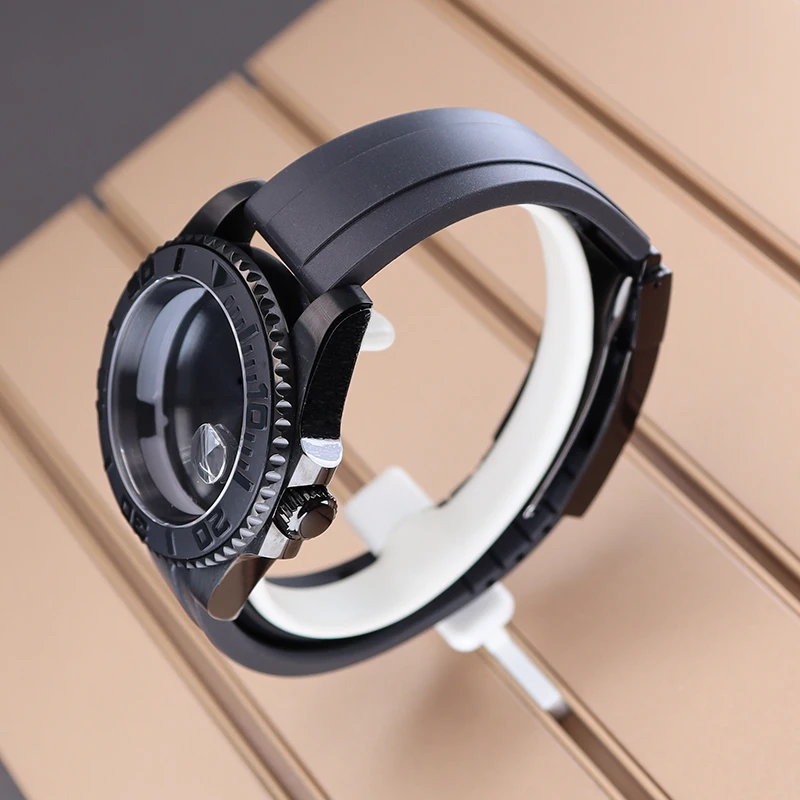 This rugged 40mm black diver watch case, crafted from solid 316L stainless steel with a thickness of 13.2mm, combines durability and style. It features a sapphire crystal glass for clear visibility and 100 meters water resistance, perfect for adventurous watersports. The textured, gear-like bezel with engraved numerals enhances its utilitarian look, while the wide 20mm rubber strap offers comfort and a sporty aesthetic. Compatible with popular movements including NH35, NH36, NH34, NH38, 4R36, Miyota 8215, 8205, and ETA 2824, this versatile case set also offers options for transparent or solid stainless steel bottom covers, making it ideal for customizing your watch.