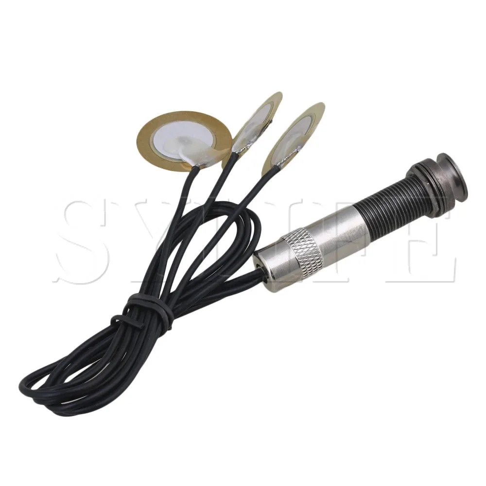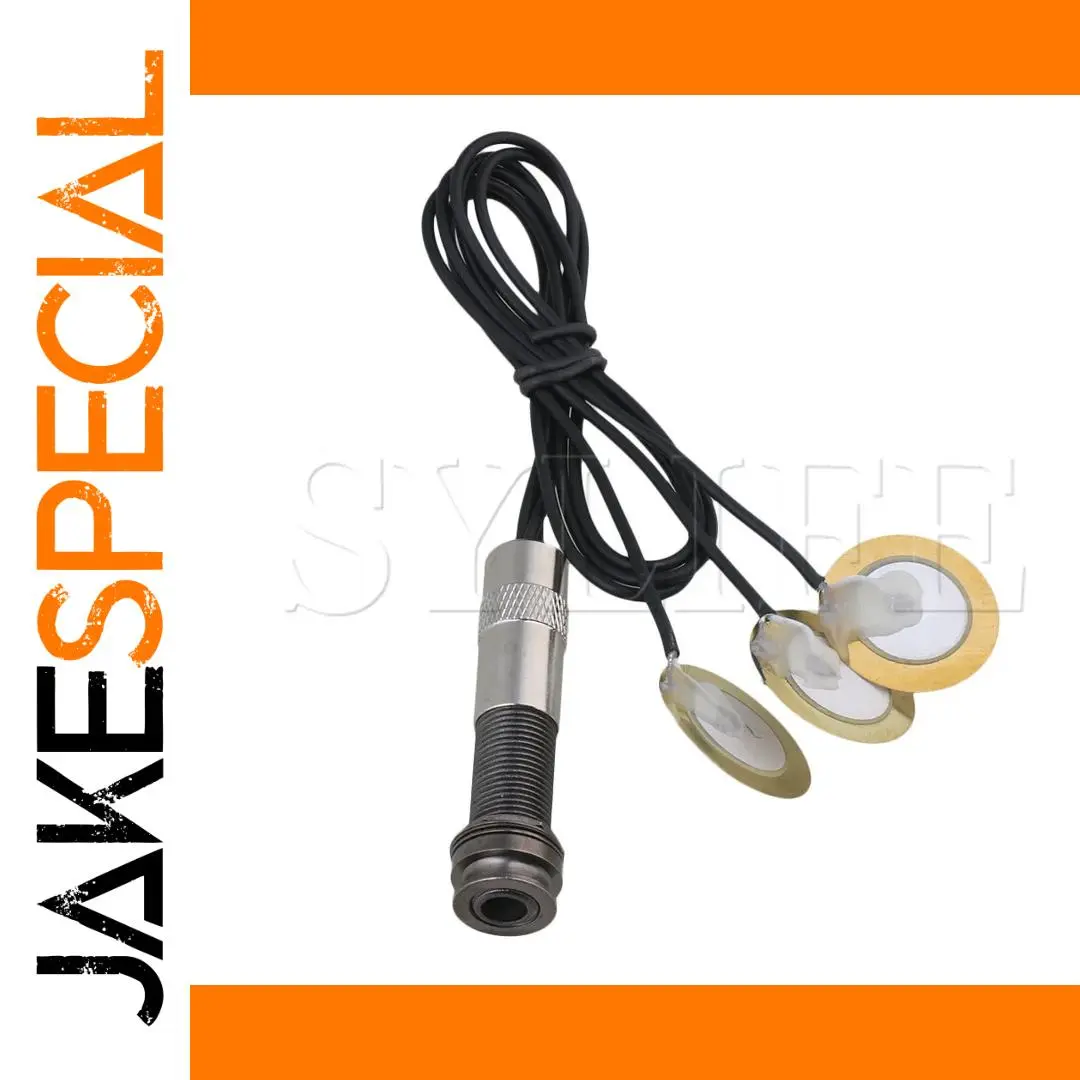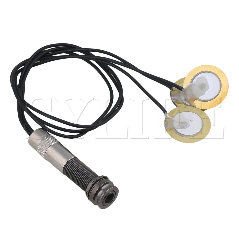 Enhance your acoustic sound with this high-quality contact microphone pickup, designed specifically for guitar enthusiasts. Its elongated, cylindrical shape offers a modern look, featuring a durable black metal and plastic construction. The device contains three small, disc-shaped sensors with elegant white encasements bordered in gold, providing a sophisticated visual contrast. The 6.35mm jack ensures compatibility with amplifiers and sound systems. Lightweight at just 39 grams, this pickup is easy to install and portable for gigging or practice sessions. Its precise measurements (61mm length, 16mm diameter) and sensor dimensions (27mm length, 0.6mm diameter) guarantee a snug fit on your instrument, capturing vibrations with clarity and fidelity. Invest in this essential tool to elevate your guitar’s sound quality effortlessly.