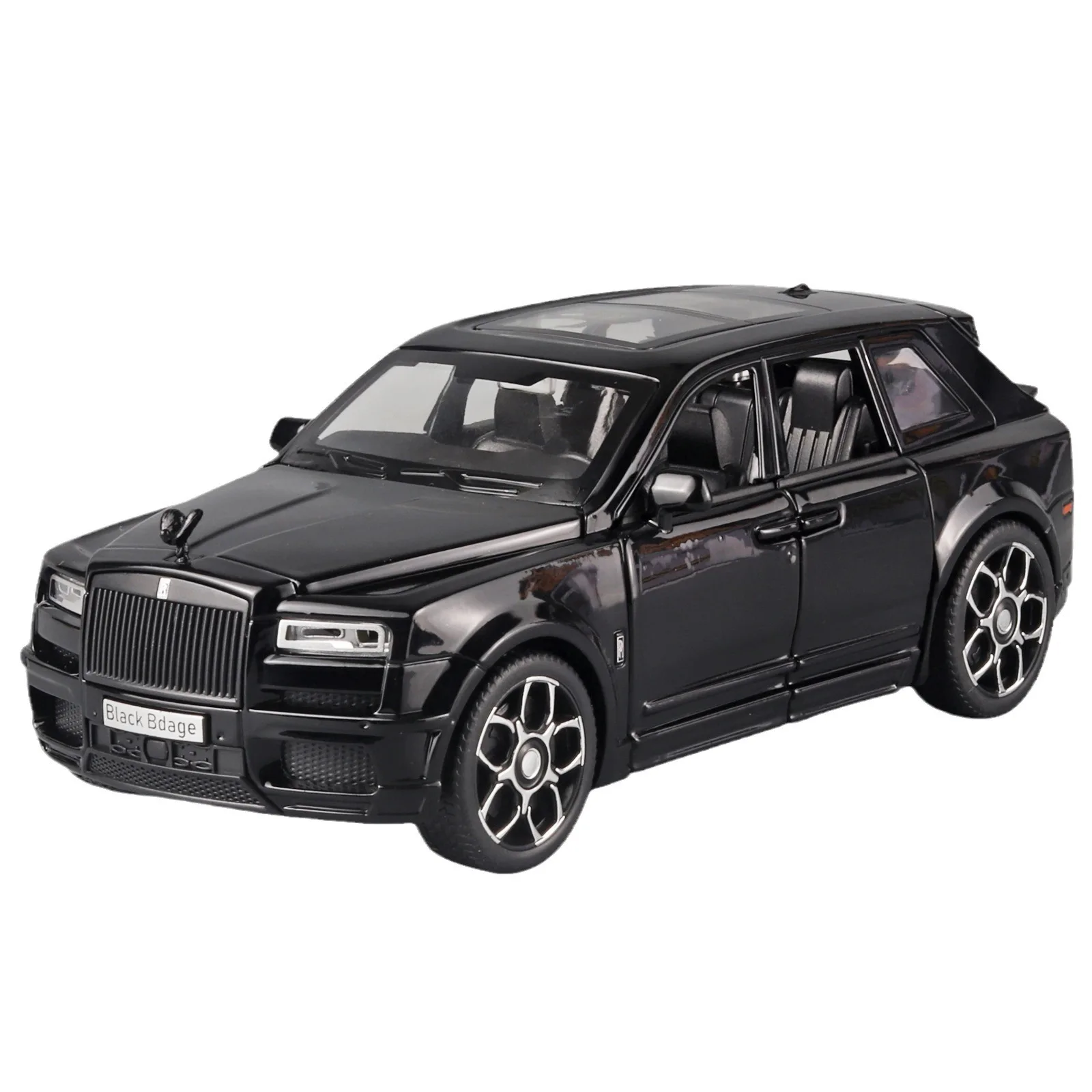 - Features realistic design details such as a front grille with vertical slats, detailed headlights, multi-spoke rims, and a panoramic sunroof for a modern aesthetic.