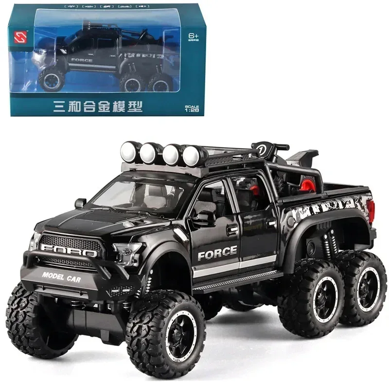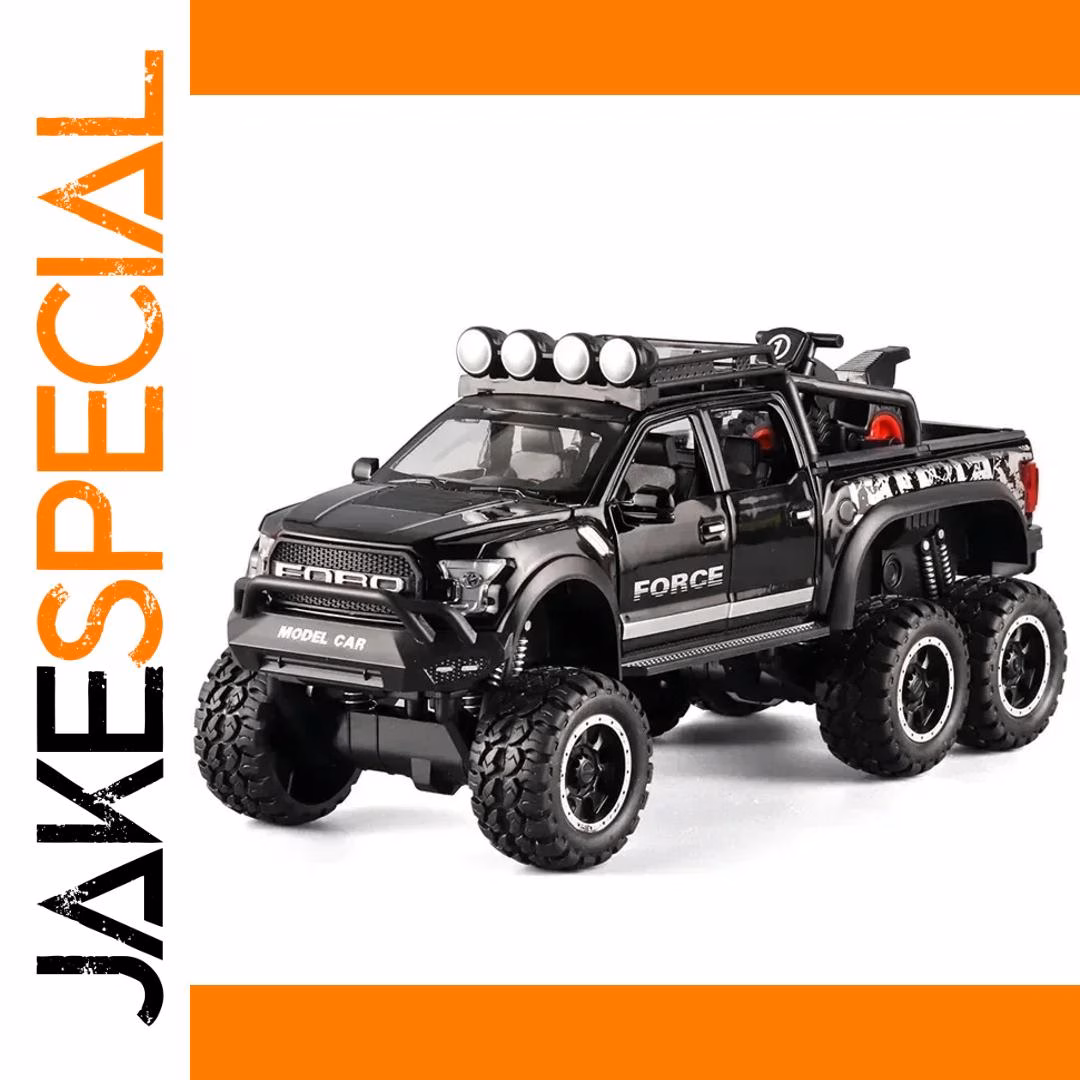 Experience the thrill of rugged off-road adventures with this highly detailed 1:28 scale alloy SUV model, perfect for collectors and enthusiasts aged 14 and above. Designed with meticulous precision, it features a striking black finish with matte and gloss accents that highlight bold design elements. The aggressive front grille with “FORCE” branding, angular bumper lines, and skid plate convey durability and expedition readiness. The roof rack is equipped with four large auxiliary lights, adding an adventurous aesthetic. The side profile displays realistic doors with handles and branding details. Heavy-duty tires with silver accents emphasize off-road capability, while the sturdy chassis and visible suspension components underscore its rugged quality. This static model makes an ideal display piece for car enthusiasts who value authenticity and craftsmanship.