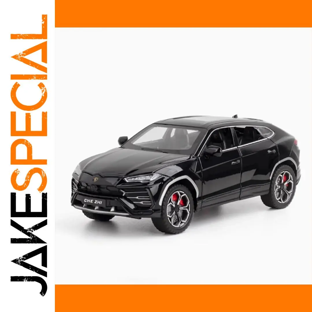 Experience the sleek, modern design of this detailed 1:24 scale alloy SUV model, crafted with precision and passion. Measuring approximately 21 cm long, 8 cm wide, and 6 cm high, it showcases a sophisticated black glossy finish that highlights the metallic alloy construction. The streamlined shape features a sporty sloped roofline, bold wheel arches, and finely detailed elements such as a distinctive grille, LED-like angular headlights, and an aggressive bumper. The side profile includes black side mirrors, integrated door handles, and chrome trim along the window line, adding elegance. The silver and black alloy rims with red brake calipers, combined with textured tires, enhance its off-road aesthetic. Perfect for display, collection, or decoration, this model brings a touch of realism and style to any space.