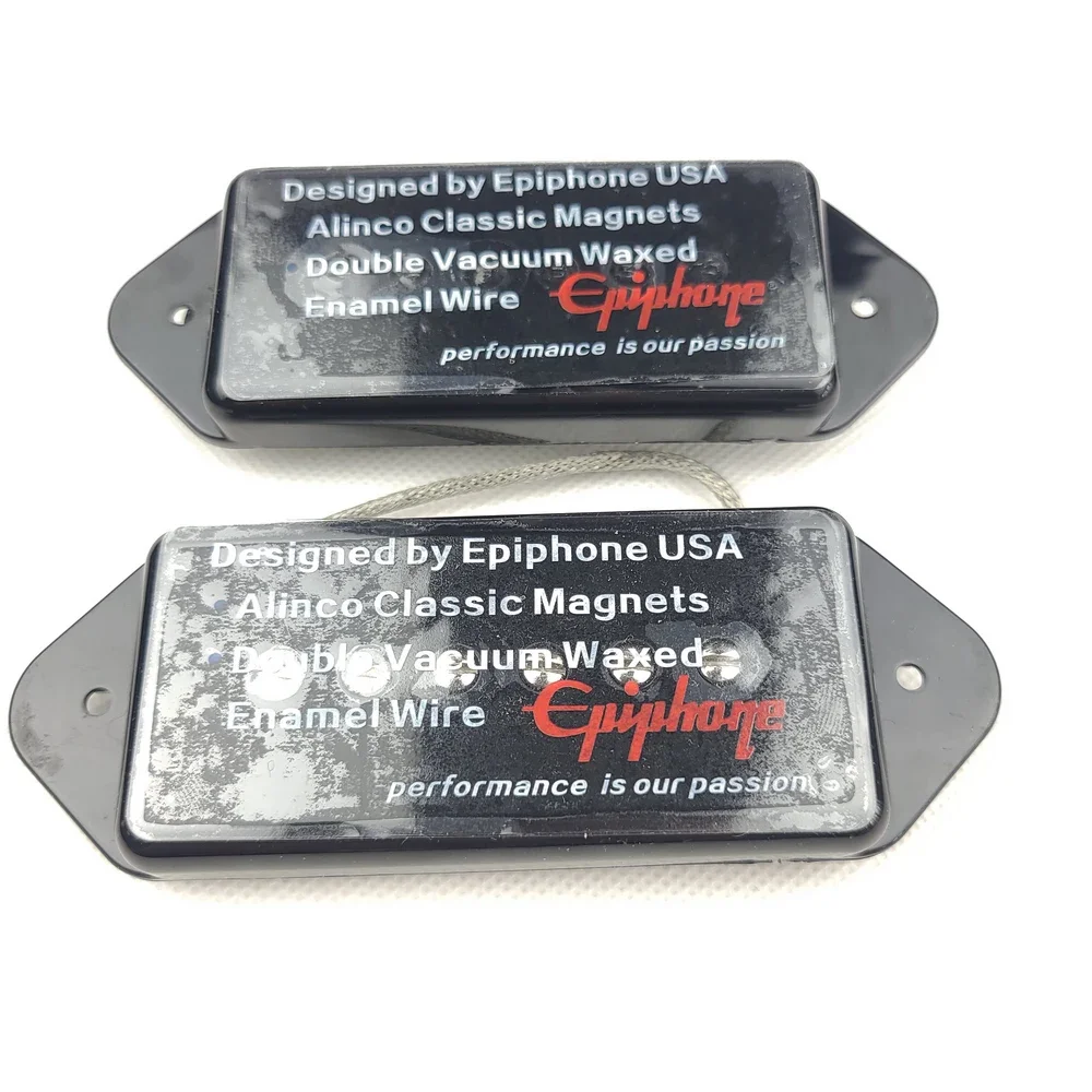 - Solid black metal covers with a sleek glossy finish for a modern look. The top pickup is polished, while the bottom has a weathered, vintage appearance with scratches and chips.