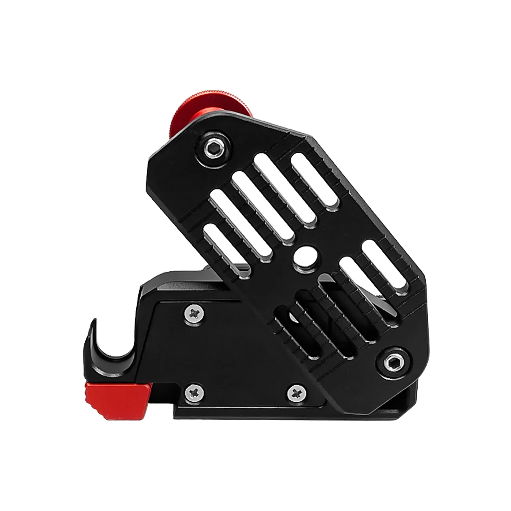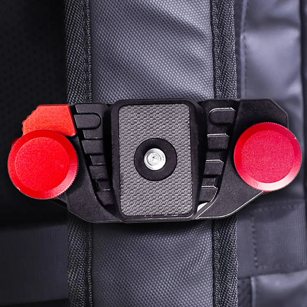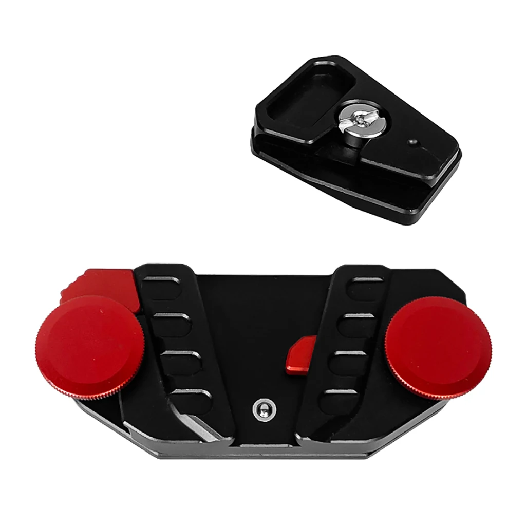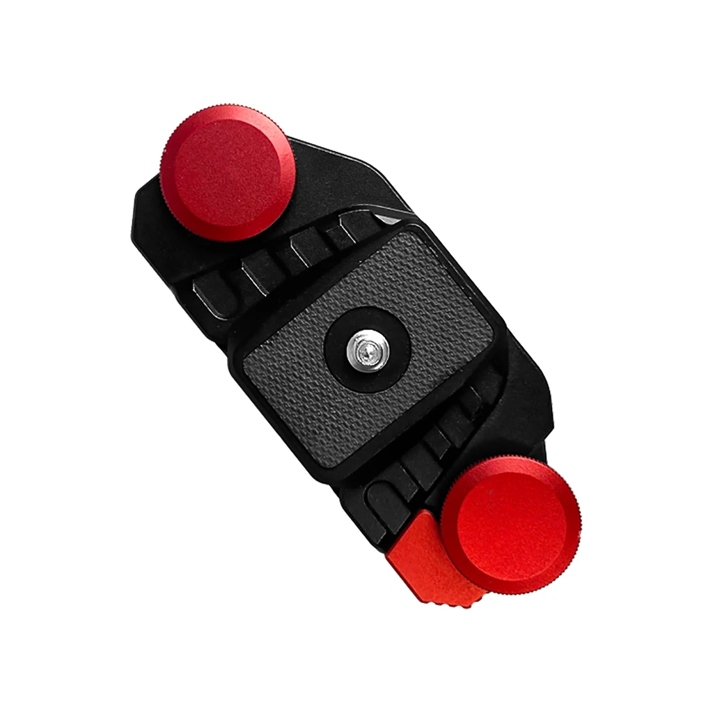 Experience seamless camera support with this black quick-release shoulder strap clamp, designed for both professional and enthusiast photographers. Crafted from durable aluminum alloy, it offers a lightweight yet sturdy solution for securely attaching your camera to a shoulder strap. Its compact dimensions—60mm in length, 38mm in width, and 20mm in height—make it unobtrusive while maintaining excellent strength. The matte black finish ensures a modern look, while the textured mounting plate provides a secure grip. The two bright red circular knobs offer easy adjustment and quick attachment or removal, making your photography setup more efficient. This support system makes switching lenses or camera configurations effortless, allowing you to focus on capturing moments without hassle.