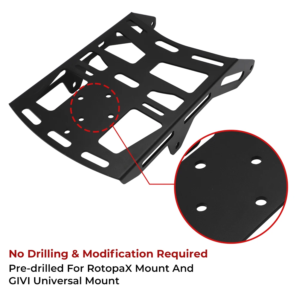 - The rack is pre-drilled for versatile mounts such as RotopaX and GIVI, and includes all necessary hardware, plus an easy installation process taking approximately 30 minutes.