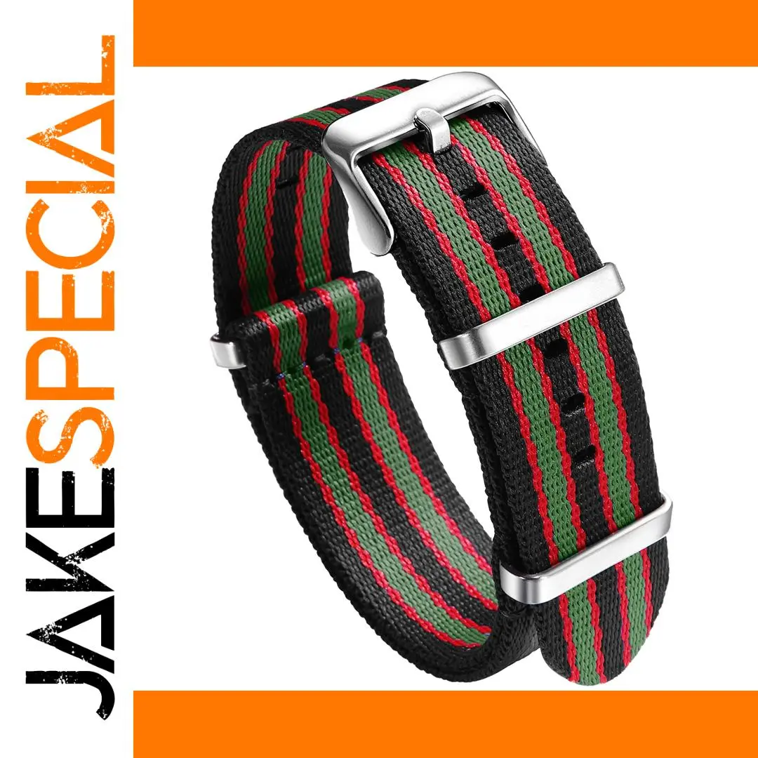 Upgrade your timepiece with this stylish Nylon Watch Band, designed for 20mm and 22mm lug widths. The sleek black fabric, enhanced with bold red and green stripes, radiates both vibrancy and elegance. Crafted from high-quality woven nylon, this strap offers durability and comfort, making it perfect for everyday wear or outdoor adventures. Featuring a polished stainless steel pin buckle and adjustable keeper rings, this watch band ensures a secure and customizable fit. Picture yourself wearing this classic military-style band, blending practicality with a fashionable edge, ready to impress on any occasion.