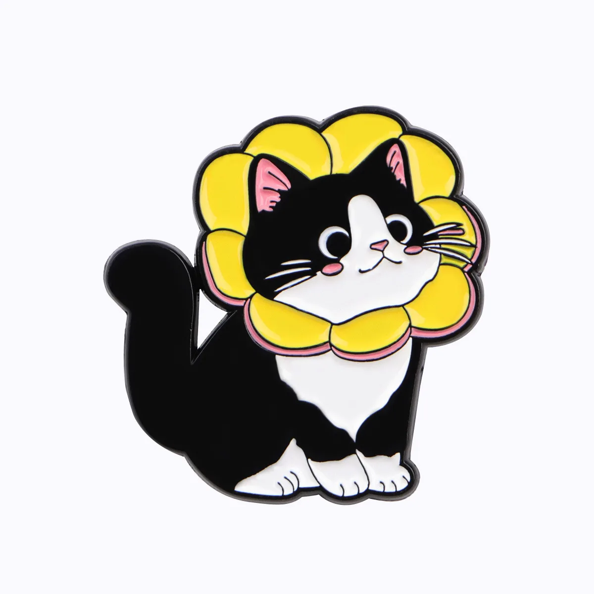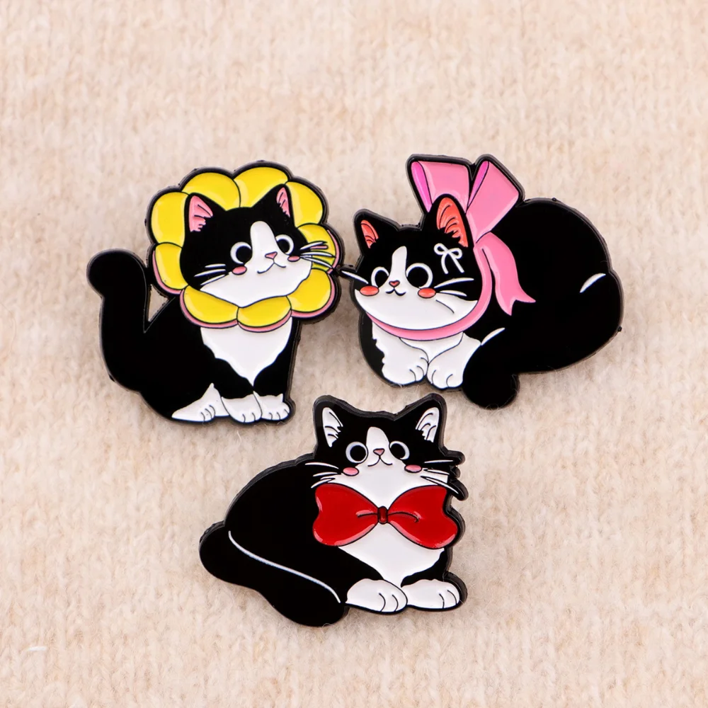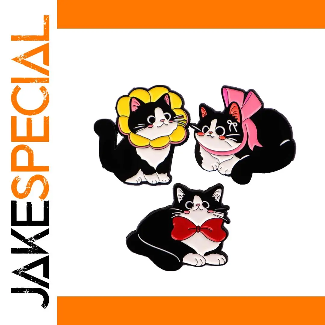 Imagine adding a touch of playful charm to your wardrobe with this adorable black and white cat brooch. Crafted from durable alloy, this accessory features a glossy finish that accentuates its vibrant colors and detailed design. The whimsical style showcases three distinct cat expressions, each decorated with charming accessories: a cheerful yellow floral collar, a sweet pink bow, and a bold red bowtie, making it perfect for expressing your personality and adding a fun element to your outfits. Whether pinning it on a jacket, backpack, or hat, this piece is versatile and will effortlessly elevate your look. Its cheerful and charming aesthetic makes it an ideal addition for any collection of accessories.
