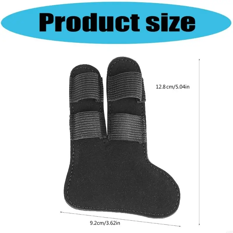 - Technical specifications include: leather composition, size of 12.8×9.2cm, breathable perforations, elastic strap fit, sweat-resistant design, suitable for left or right fingers.