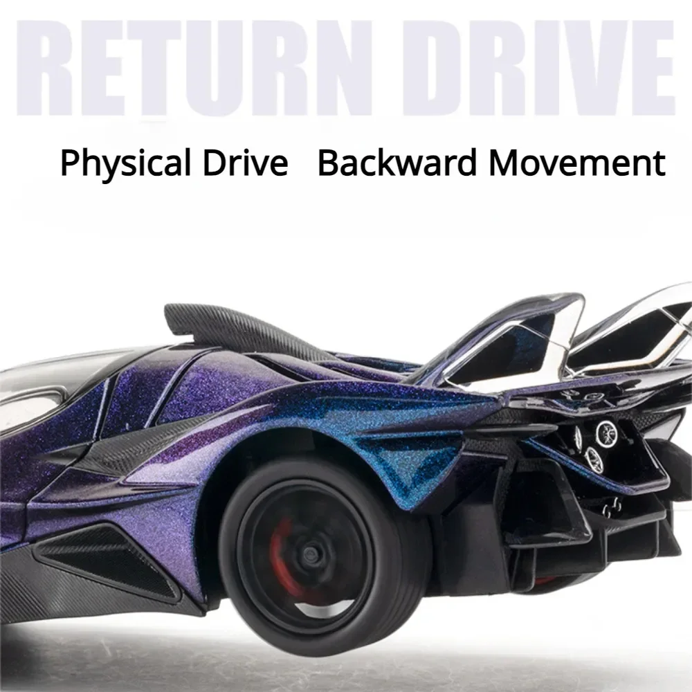 Experience the thrill of high-performance engineering with this realistic 1/24 scale Apollo EVO alloy sports car model. Measuring approximately 20 cm long, 8.5 cm wide, and 5 cm high, this meticulously crafted diecast replica features a sleek metal body, plastic chassis, and rubber tires that replicate the authentic look and feel of a real supercar. The glossy black finish highlights its dynamic lines, sharp contours, and aggressive design elements like angular body panels and a prominent rear wing. With its opening doors, integrated lighting, and sound functions, you can truly bring this model to life. Designed for passionate collectors and enthusiasts, it offers a visually stunning addition to any display or collection.