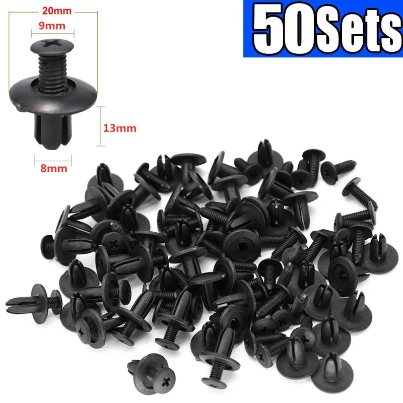 Imagine having a reliable supply of high-quality fasteners for your vehicle repairs or modifications. These black plastic rivets are designed to provide a secure and durable hold, especially for bumper and fender applications. With a sleek matte finish and a simple, functional style, they blend seamlessly into your car's interior or exterior. Whether replacing a few or stocking up for multiple projects, this versatile set ensures you have the right size on hand. Each rivet features a 20mm head diameter, 13mm stem length, and an 8mm hole size, ensuring compatibility with most automotive bodywork. Easy to install and remove, these rivets will become your go-to fastening solution.