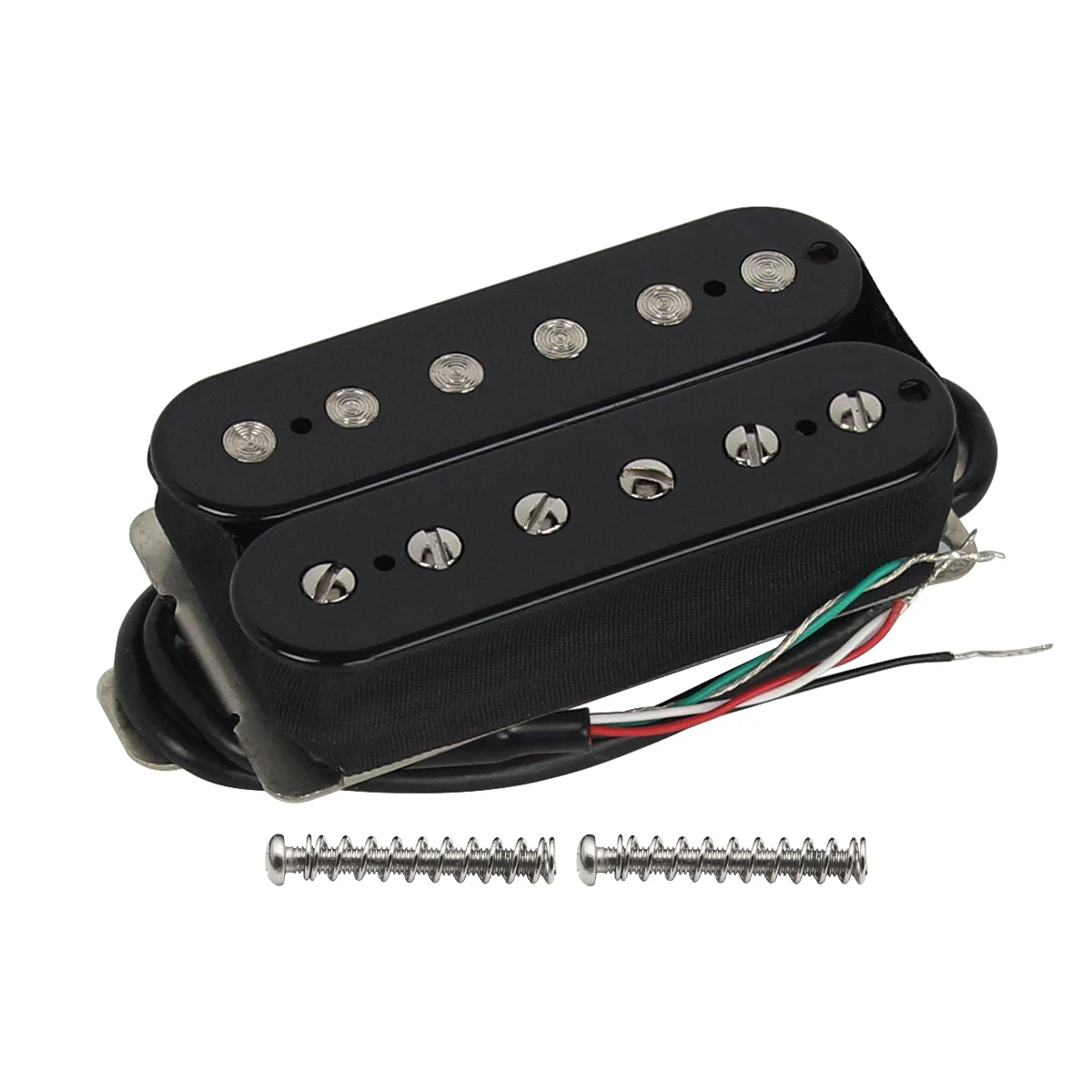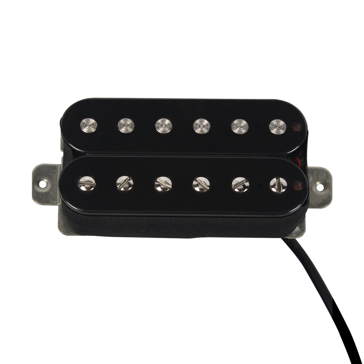 Experience the sleek, professional look and powerful sound of this this black guitar humbucker pickup. Designed with a durable metal and plastic construction, it features a polished, black metal cover with rounded edges that exudes a modern aesthetic. The top surface showcases two parallel rows of flat, circular pole pieces—creating a clean, symmetrical appearance. Perfectly suited for the bridge position, this pickup delivers a rich, high-output tone thanks to its ceramic magnets and resistance of 14-15K ohms. Its wax-potted, sealed design ensures sustained performance, reducing unwanted noise. With four wires, you have multiple wiring options to tune your sound. Whether upgrading your guitar or customizing your tone, this pickup provides both durability and style for your setup.