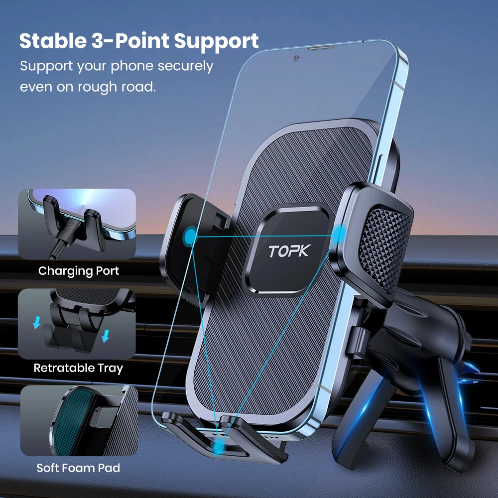 Imagine having your smartphone securely mounted on your car’s air vent, ready for quick access at any moment. This sleek black car phone holder by TOPK blends contemporary design with functionality, enhancing your driving experience. Crafted with a reinforced vent clip compatible only with horizontal blade air vents, it ensures a robust grip that stays put on bumpy roads. The adjustable, rotatable support ring and bottom foot allow you to find the perfect viewing angle, while the innovative hollow silicone rubber cushion guarantees your phone remains secure without slipping or drops. Its thick silicone layer offers added protection against daily wear, making it a durable, reliable accessory. Easy to operate with one hand, this holder keeps your focus on the road while keeping your device within easy reach.