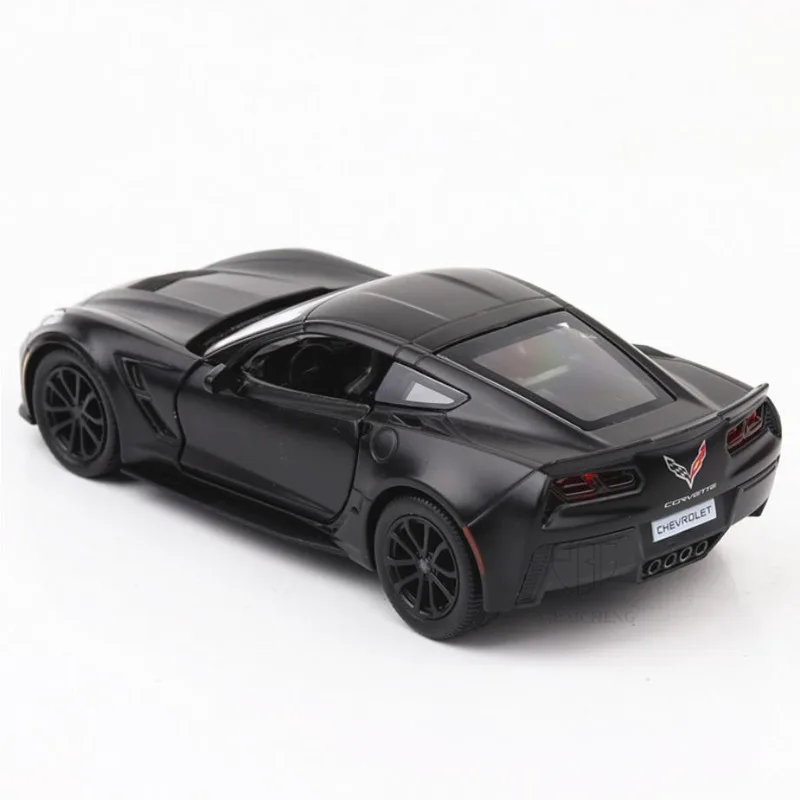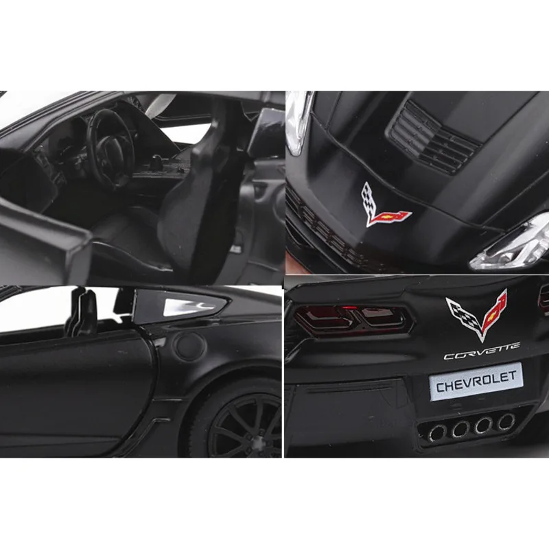 Experience the thrill of owning this stunning 1/36 scale diecast Chevrolet Corvette C7, finished in a sophisticated matte black. Crafted with precision, this high-simulation car captures the iconic curves, sharp angles, and aerodynamic profile of the real vehicle. Its smooth, flowing contours are complemented by detailed features like the grille, angular headlights, sculpted side lines, and an integrated rear spoiler, all contributing to its aggressive stance. Made with a durable metal body, plastic chassis, and rubber tires, the model offers remarkable realism. The functional doors and pull-back mechanism allow you to showcase or play with this beautifully detailed replica, making it a perfect addition for collectors and enthusiasts alike. Feel the passion of high-performance design right at your fingertips.